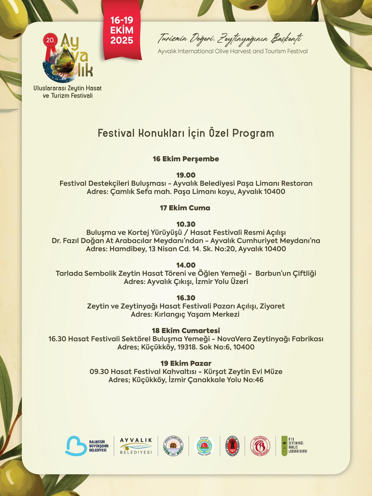 20. Ayvalık Uluslararası Zeytin Hasat ve Turizm Festivali; 17 Ekim Cuma günü saat