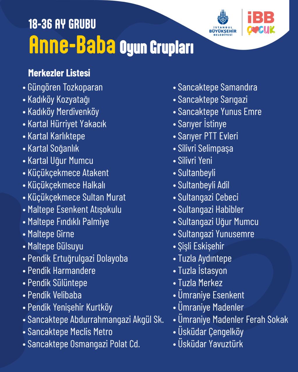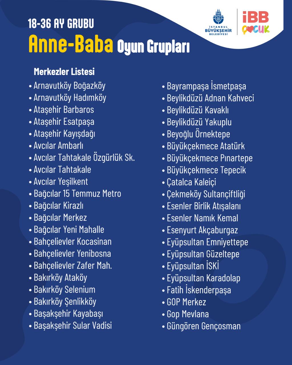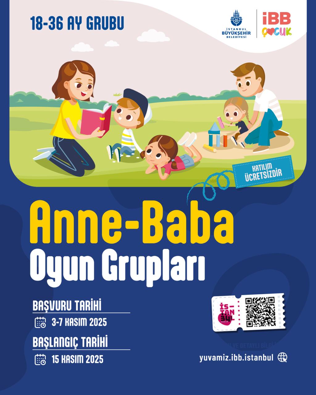 İstanbul Büyükşehir Belediyesi (İBB) Sosyal Hizmetler Dairesi Başkanlığı Çocuk Hizmetleri Şube Müdürlüğü tarafından yürütülen ‘Anne Baba Oyun Grubu Hizmeti’ için başvurular, 03-07 Kasım 2025 tarihleri arasında alınacak.