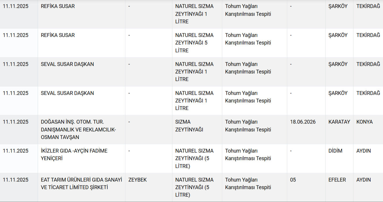 Liste; zeytinyağı, etli ekmek, pide harcı gibi pek çok farklı gıda ürünündeki taklit ve tağşiş vakalarını da içeriyor.