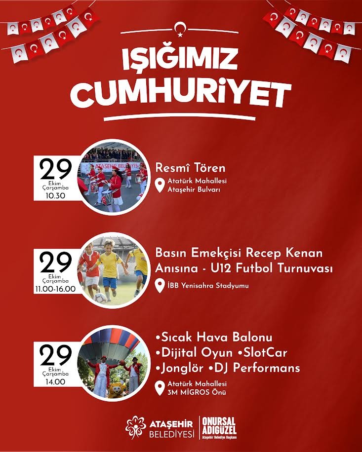 Cumhuriyetimizin ilanının 102. yıl dönümü tüm Türkiye’de olduğu gibi Ataşehir’de de büyük bir coşkuyla kutlanacak. Ataşehir Belediyesi’nin 29 Ekim Cumhuriyet Bayramı’na özel olarak hazırladığı etkinlikler kapsamında; konser, balo, sergi, fener alayı yürüyüşü, futbol turnuvası, sıcak hava balon gösterisi ve Türkiye’nin en uzun koşu parkurunun lansmanı gerçekleştirilecek.