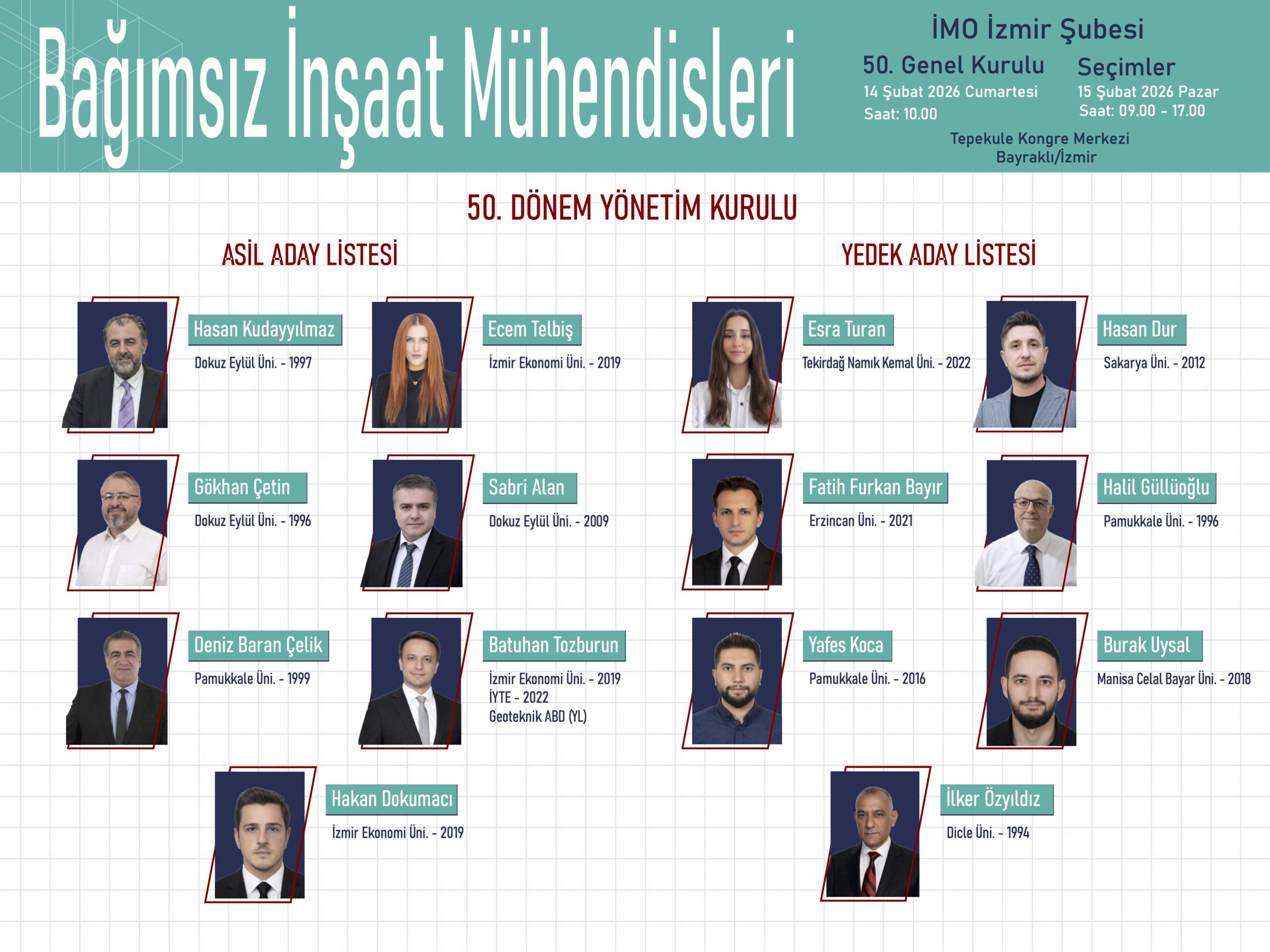 İzmir İnşaat Mühendisleri Odası’nın (İMO) seçimli 50. Genel Kurulu öncesinde adaylığını açıklayan Bağımsız İnşaat Mühendisleri Grubu, mesleki dayanışmanın önemine dikkat çeken bir açıklama yayımladı.