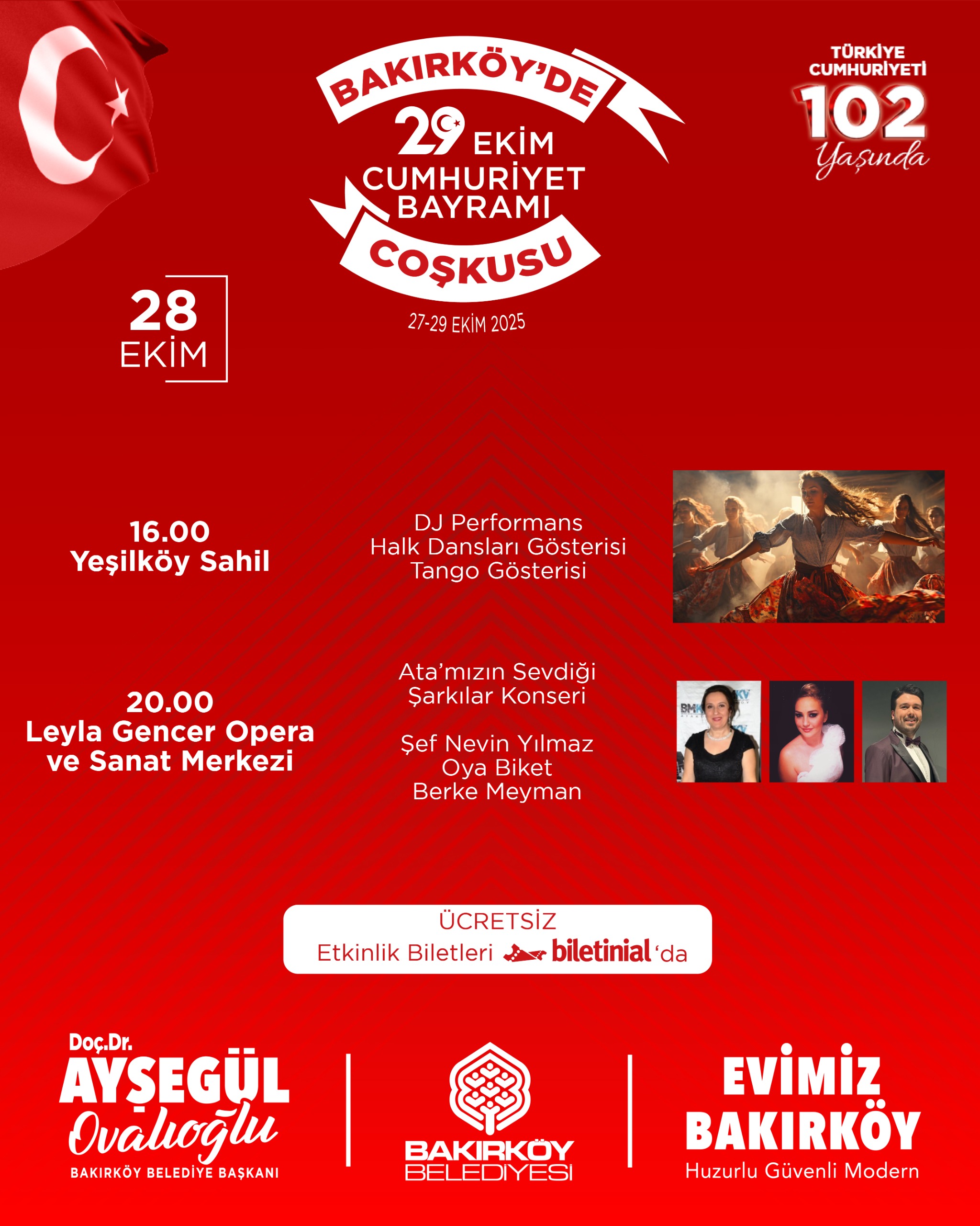 28 Ekim Salı günü saat 16.00’da Yeşilköy Sahili, DJ performansı, halk dansları ve tango gösterileriyle bayram havasına bürünecek. Aynı akşam 20.00’de Leyla Gencer Opera ve Sanat Merkezi’nde, Şef Nevin Yılmaz yönetimindeki “Ata’mızın Sevdiği Şarkılar” konserinde Oya Biket ve Berke Meyman sahne alacak.