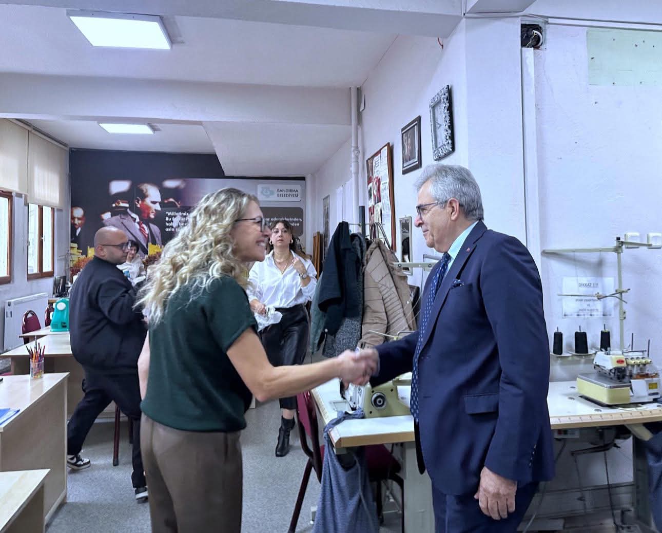 Bandırma Belediye Başkanı Dursun Mirza ve Belediye Başkan Yardımcısı Niyazi Yeloğlu, Harun Karacan Gençlik ve Spor Merkezi’ndeki kursiyerleri ziyaret etti. Ziyaret kapsamında dikiş kursunda eğitim gören kadınlarla bir araya gelen Başkan Mirza, kursiyerlerin çalışmalarını yerinde inceledi.