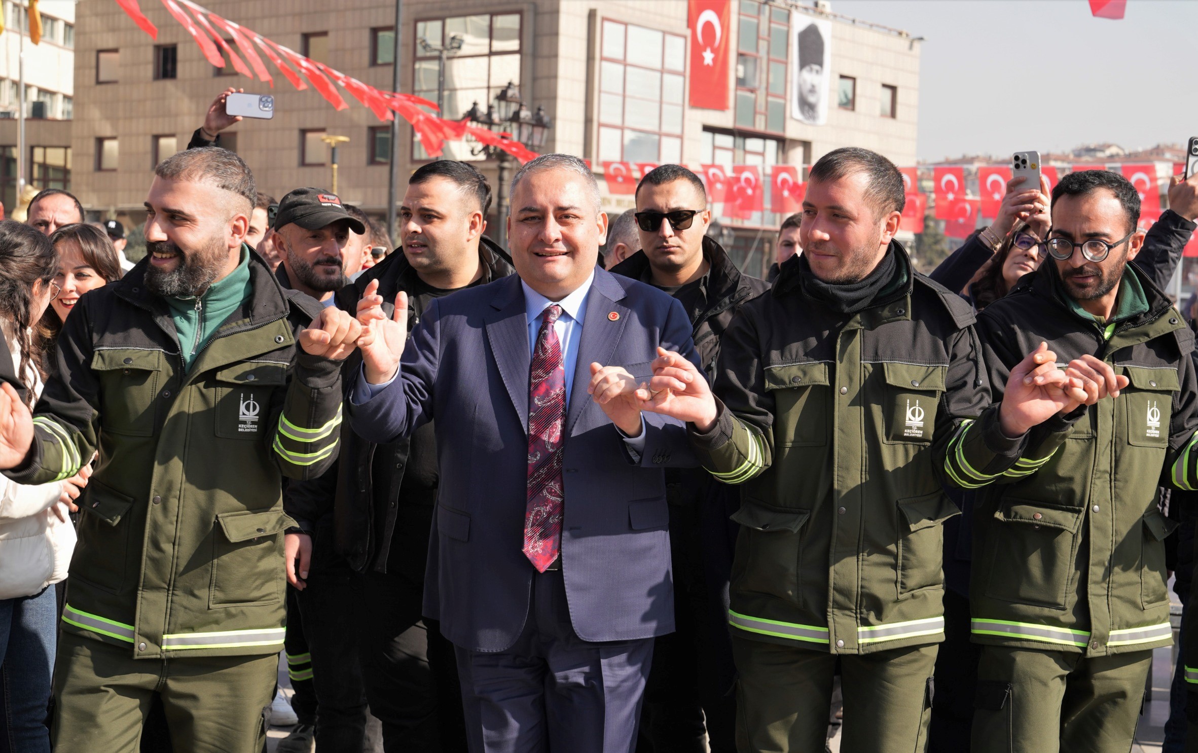 Belediye önünde düzenlenen törenle işçiler zam oranlarını öğrenmenin sevincini yaşadı. Saygı duruşu ve İstiklal Marşı’nın okunmasıyla başlayan programa; Keçiören Belediye Başkanı Dr. Mesut Özarslan’ın yanı sıra Hizmet İş Sendikası Genel Sekreteri Mehmet Yeşilyurt, belediye başkan yardımcıları, meclis üyeleri, sendika temsilcileri ve belediye işçileri katıldı. Davullu zurnalı törende zam miktarını öğrenerek büyük sevinç yaşayan işçiler halay çekerek kutlama yaptı. Başkan Özarslan da işçilerle halay çekerek onların mutluluğuna ortak oldu.