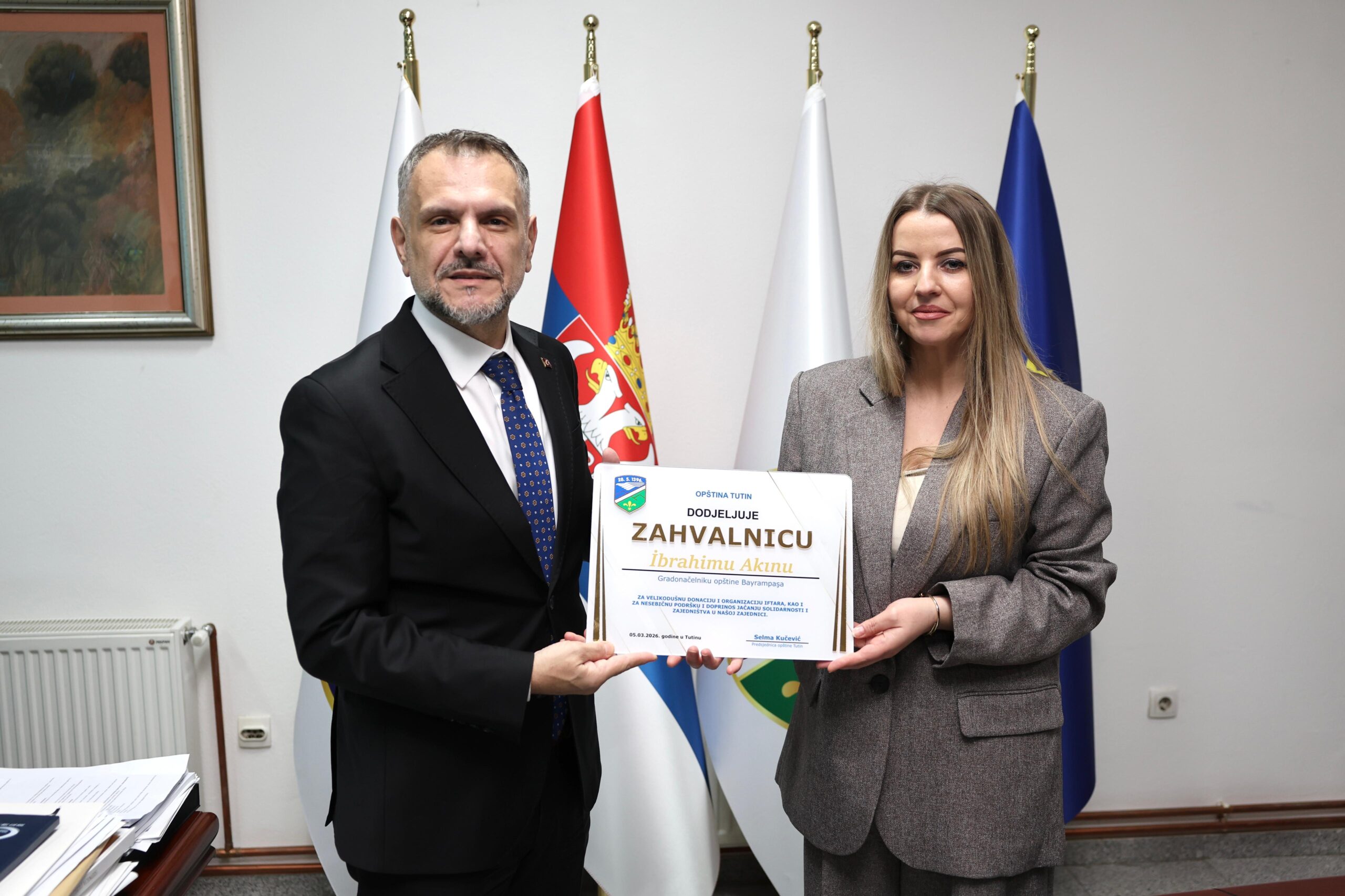 Bayrampaşa Belediye Başkan Vekili Akın, iftar programı öncesinde Tutin Belediye Başkanı Selma Kuçeviç’i makamında ziyaret etti. Görüşmede iki toplum arasındaki tarihi bağlar ve kültürel ilişkiler üzerine değerlendirmelerde bulunuldu. Ziyaret, karşılıklı iyi niyet temennileri ve hatıra fotoğrafı çekimiyle sona erdi.