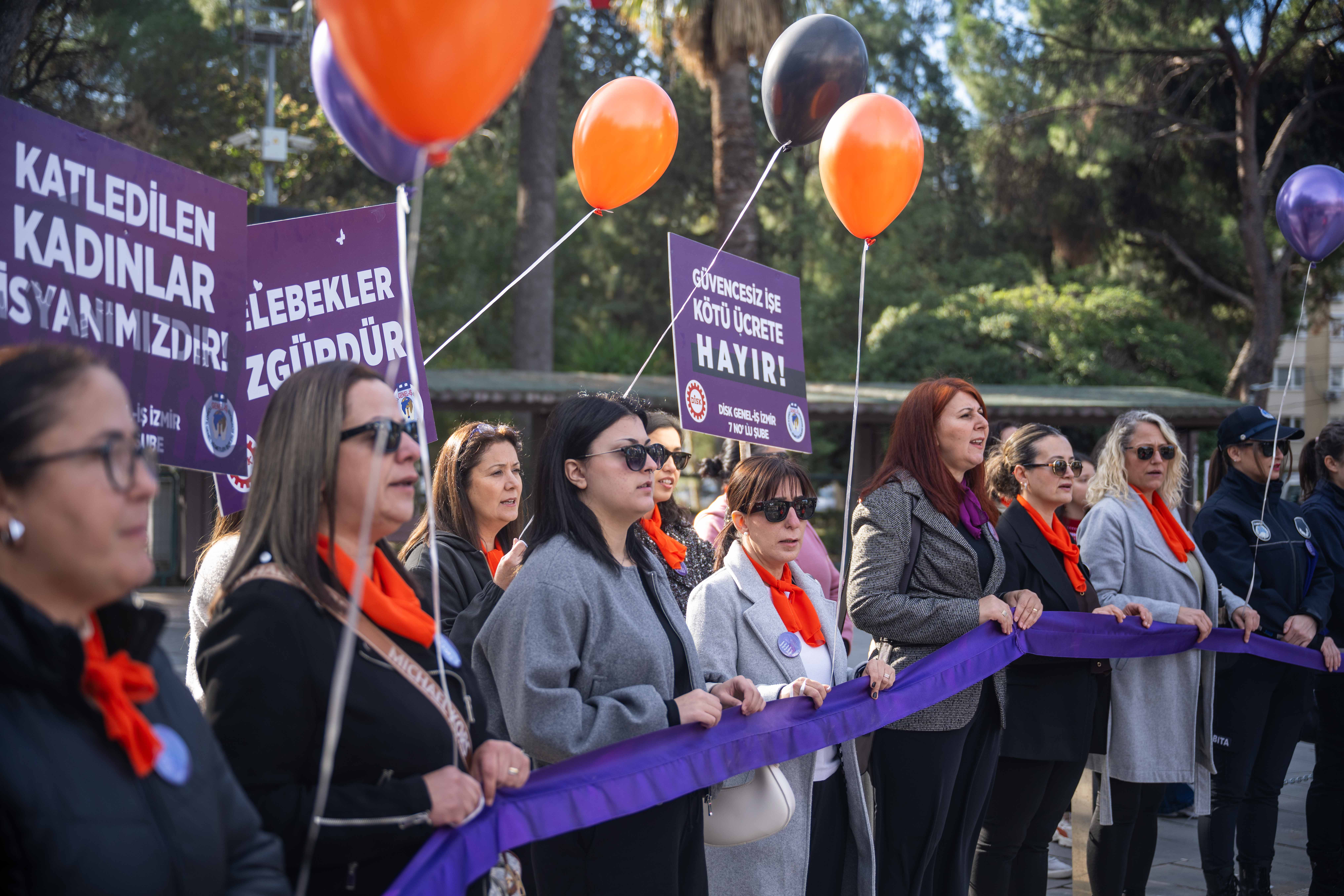 Bornovalı emekçi kadınların 25 Kasım buluşması ise Büyükpark’ta düzenlendi. Etkinlikte DİSK Genel İş 7 No’lu Şube Kadın Komitesi Başkanı Gülistan Tilkici hazırlanan bildiriyi okudu. Kadına yönelik şiddet tiyatral bir sunumla ele alınırken, katılımcılar sloganlar atarak dayanışmanın gücünü ortaya koydu. Program, balonların hep birlikte gökyüzüne bırakılmasıyla simgesel bir mesajla sona erdi.