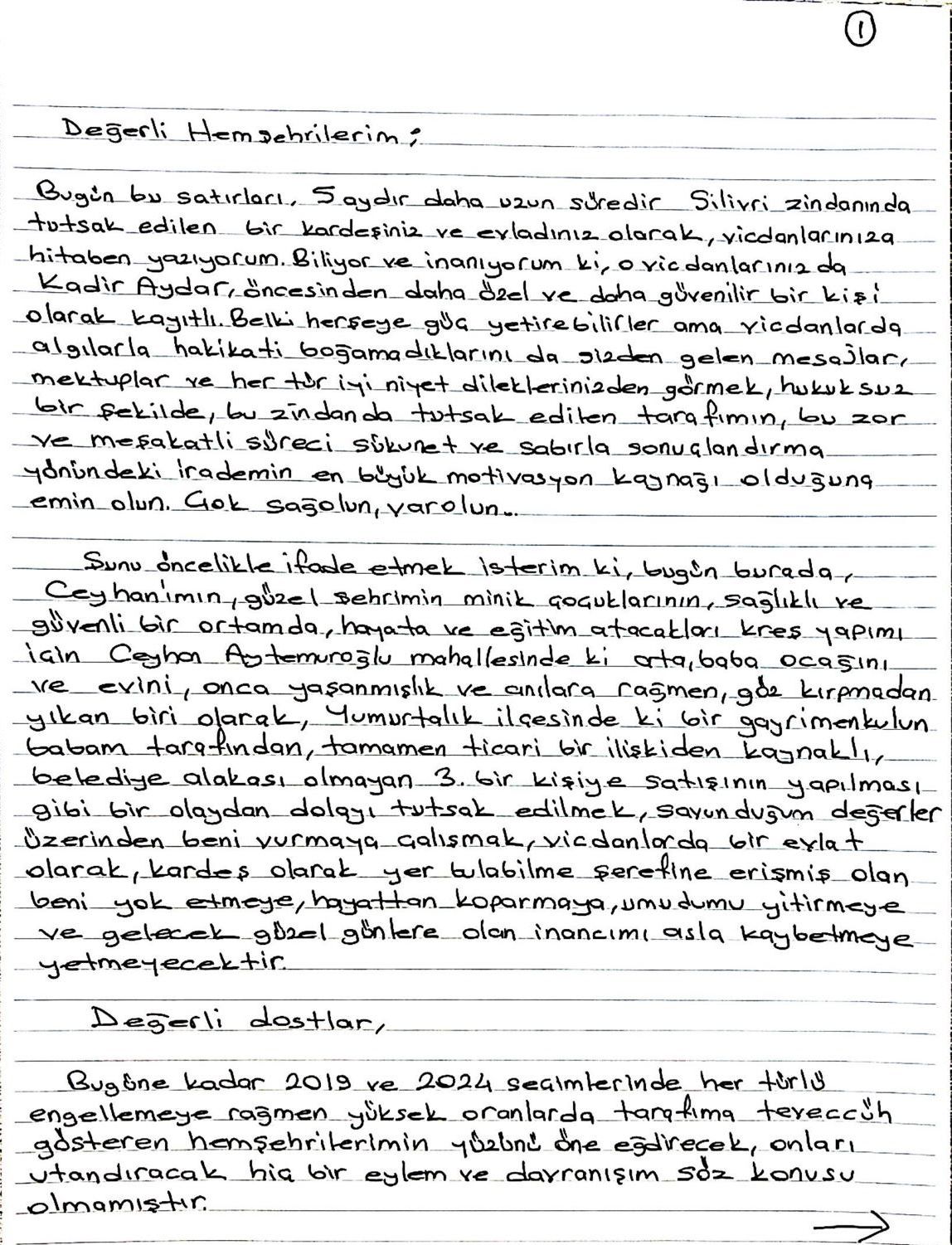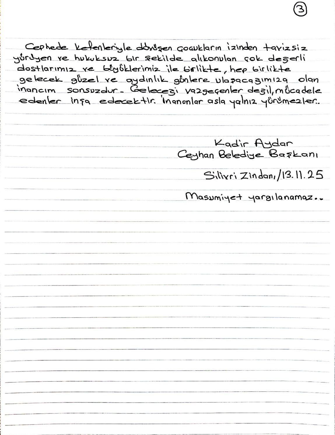 Silivri’de tutuklu bulunan Ceyhan Belediye Başkanı Kadir Aydar, 5 ayı aşkın süredir bulunduğu cezaevinden yazdığı mektubu sosyal medya hesapları üzerinden paylaştı. Aydar’ın mektubu kısa sürede geniş kitlelere ulaşarak çok sayıda yorum, beğeni ve destek mesajı aldı.