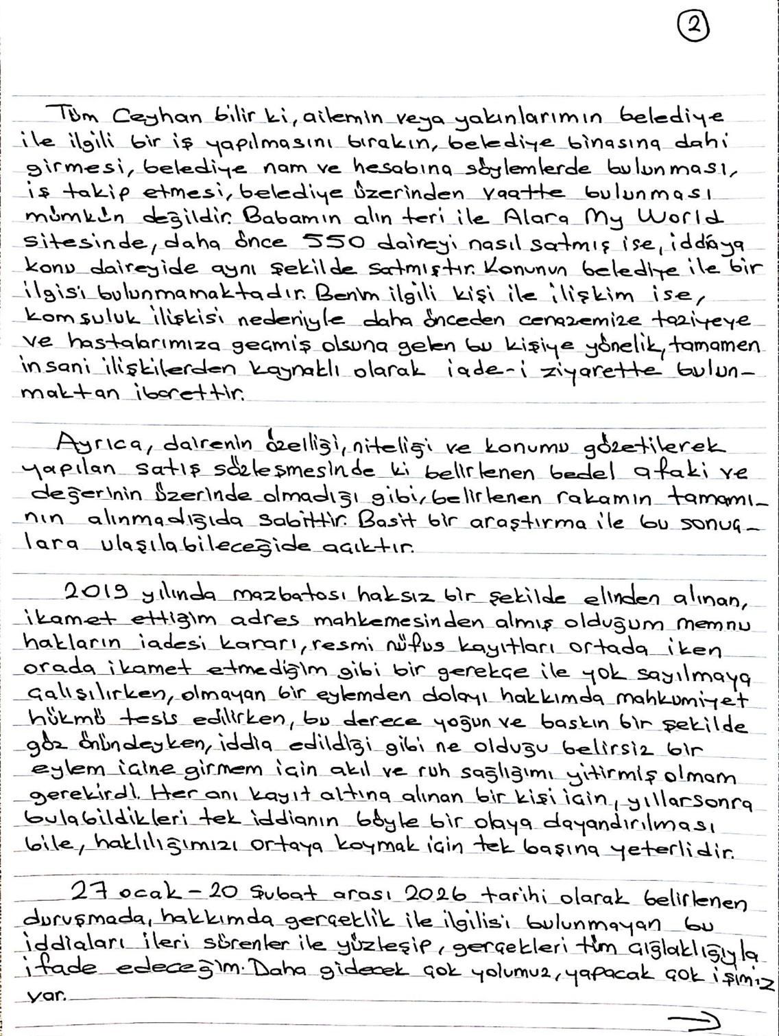 “Şunu öncelikle ifade etmek isterim ki, bugün burada, Ceyhan’ımın, güzel şehrimin minik çocuklarının, sağlıklı ve güvenli bir ortamda, hayata ve eğitim atacakları kreş yapımı için Ceyhan Aytemuroğlu mahallesinde ki ata, baba ocağını ve evini, onca yaşanmışlık ve anılara rağmen, göz kırpmadan yıkan biri olarak, Yumurtalık ilçesinde ki bir gayrimenkulun babam tarafından, tamamen ticari bir ilişkiden kaynaklı, belediye alakası olmayan 3. bir kişiye satışının yapılması gibi bir olaydan dolayı tutsak edilmek, savunduğum değerler üzerinden beni vurmaya çalışmak, vicdanlarda bir evlat olarak, kardeş olarak yer bulabilme şerefine erişmiş olan beni yok etmeye, hayattan koparmaya, umudumu yitirmeye ve gelecek güzel günlere olan inancımı asla kaybetmeye yetmeyecektir.”