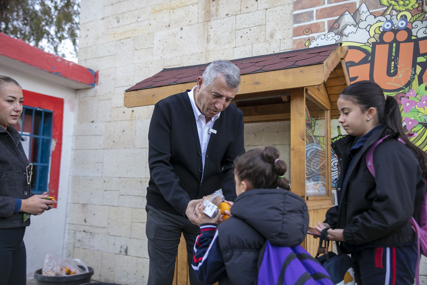 Başkan Günay, “Güzelbahçe‘de yaşayan çiftçilerimizin mandalinaları bu sene yine dalında kaldı para etmediği için köylümüz bunları toplayamadı biz de köylümüzün malını alarak ilçemizde bulunan devlet okullarına her gün dağıttığımız simit ve poğaçanın yanında bugün de mandalina dağıtıyoruz. Köylü satamadı biz de onları alıp buradaki çocuklarımıza dağıtıyoruz” diye konuştu.