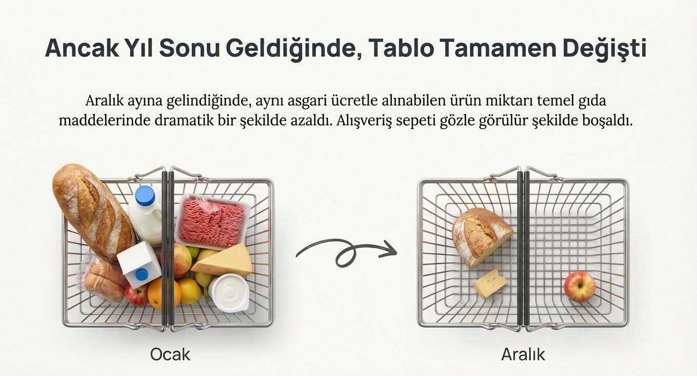 Ocak ayında maaşıyla aldığı ürünleri Aralık ayında da aynı miktarda almak isteyen bir asgari ücretlinin karşılaştığı tablo çarpıcı: