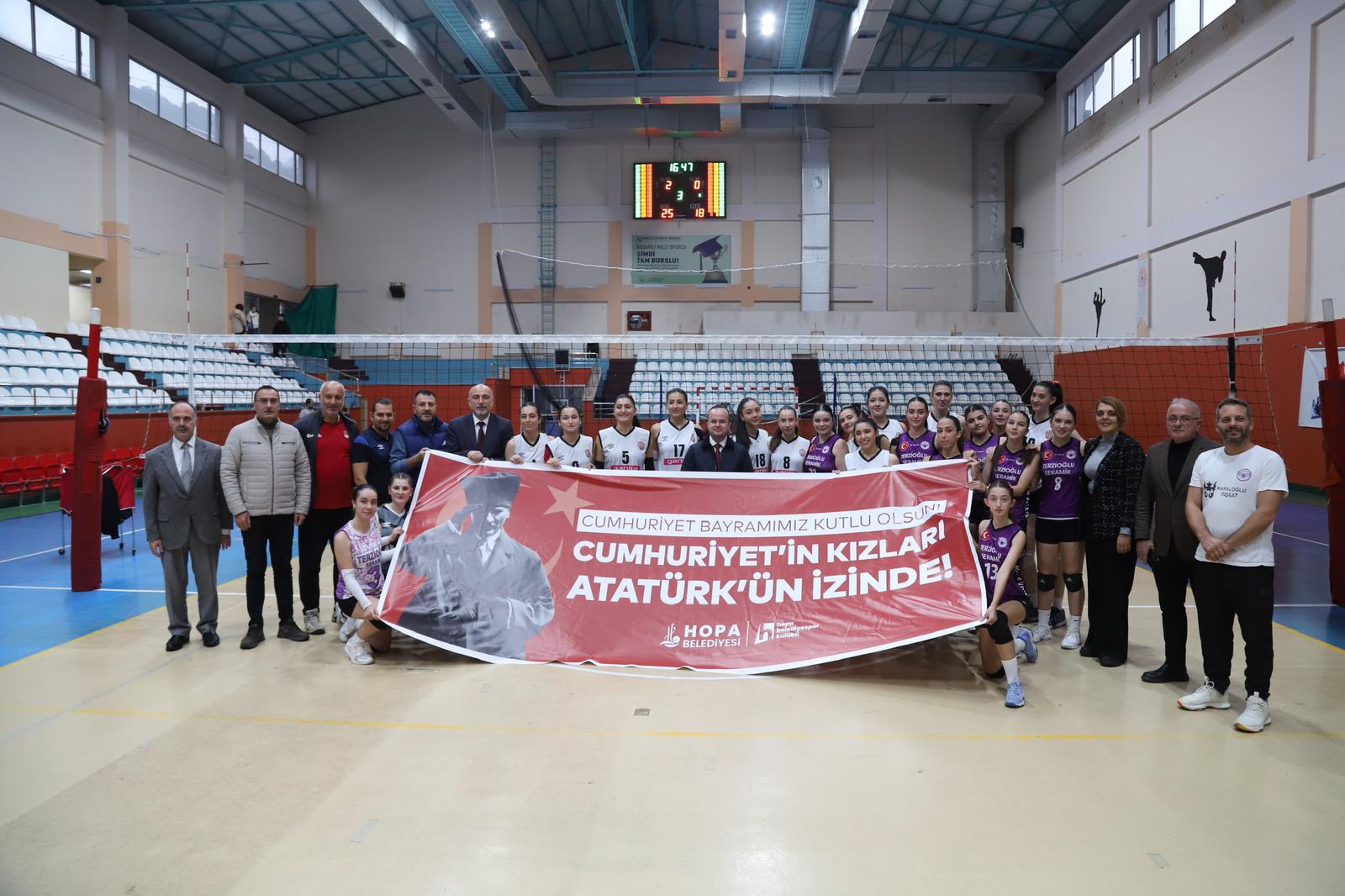 Aynı gün Hopa Gençlik ve Spor Salonu’nda oynanan Hopa Belediyespor – Osmancık Belediyesi kadın voleybol karşılaşmasıyla Cumhuriyet’in kızları sahneye çıktı. Genç sporcuların mücadelesi, tribünlerdeki Cumhuriyet coşkusunu bir kat daha artırdı.