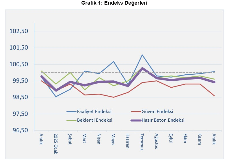 Hazır Beton Endeksi 2025 Aralık Ayı Raporu’na göre, Tüm endeksler yılın büyük bölümünde eşik değerin altında dalgalı bir seyir izledikten sonra, yılın son çeyreğinde eşik değere doğru sınırlı bir toparlanma eğilimi göstermiştir. Aralık ayında endeks değerleri kasım ayına kıyasla genel olarak belirgin bir değişim göstermemiş, endeks seviyeleri birbirine yakın bir görünüm sergilemiştir. Güven Endeksi, yıl içindeki dalgalanmaları sonrasında, aralık ayında gerileyerek diğer alt endekslerin gerisinde kalmayı sürdürmüştür. Faaliyet Endeksi yaz aylarında kaydedilen yükselişin ardından sonbahar aylarında dengelenmiş, aralık ayında ise eşik değere oldukça yakın bir seviyede yatay seyrini devam ettirmiştir. Beklenti Endeksi yıl boyunca görece istikrarlı bir görünüm sergilemiş, aralık ayında ise hafif bir düşüşle eşik değerin hemen altında kalmıştır. Son olarak Hazır Beton Endeksi, alt endekslerdeki bu sınırlı hareketliliğe paralel olarak aralık ayında yataya yakın bir görünüm sergilemiş, kritik eşik seviyesine yakın olmakla birlikte eşik değerin üzerine çıkamamıştır.