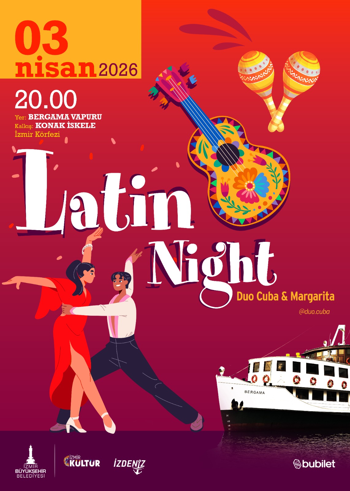 Kentte kültür ve sanatı herkes için erişilebilir kılmayı amaçlayan İzmir Büyükşehir Belediyesi ve İzmir Kültür AŞ, düzenlediği etkinliklerle İzmirlileri farklı müzik türleriyle buluşturmaya devam ediyor. “Latin Night” da bu vizyonun en keyifli örneklerinden biri olarak öne çıkıyor. İzmir’in simgelerinden Bergama Vapuru, 3 Nisan akşamı Latin müziğinin sıcak ritimleriyle adeta bir sahneye dönüşecek. Vapur, saat 20.00’de Konak İskelesi’nden hareket edecek.
