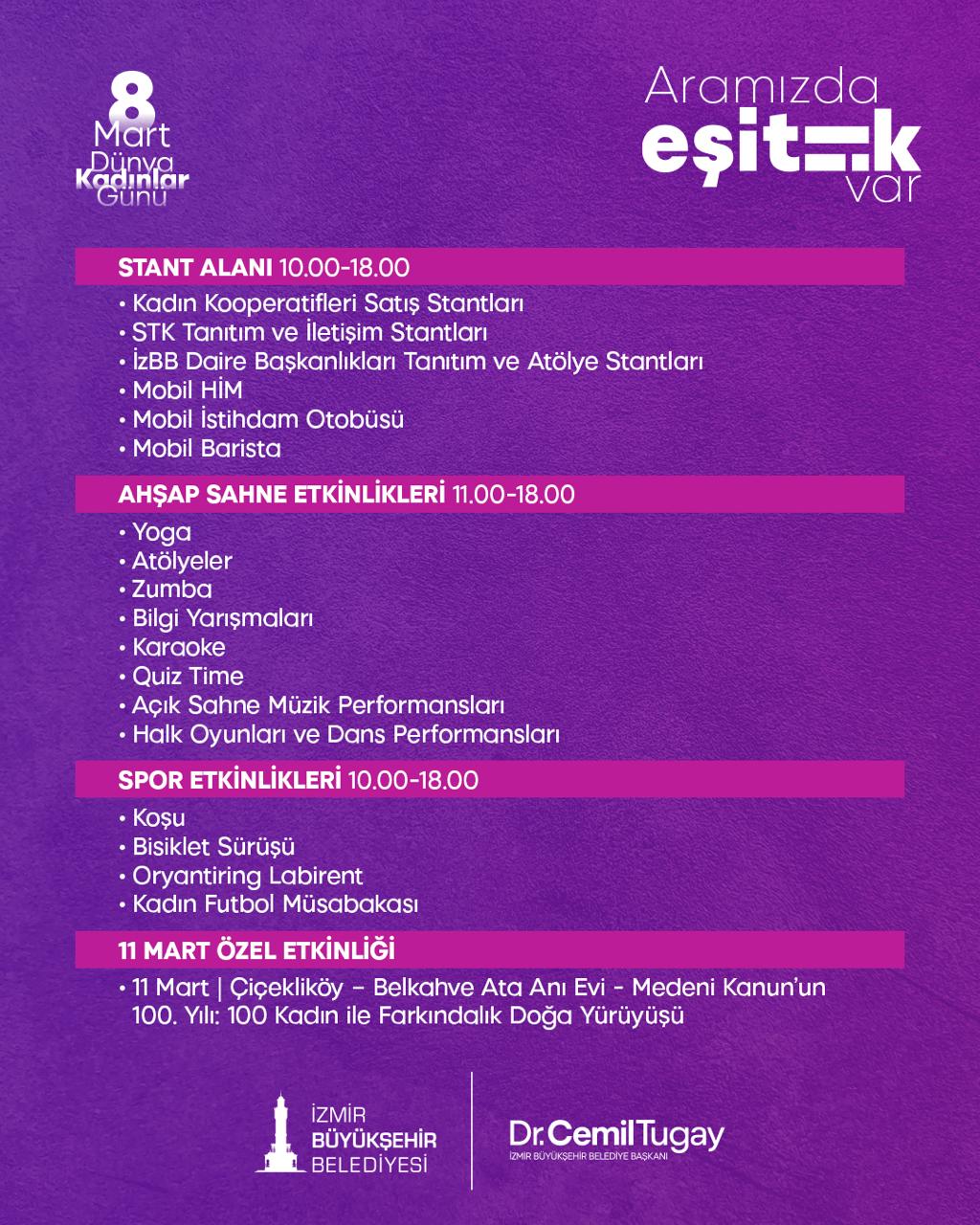 Kültürpark’ta 10.00–18.00 saatleri arasında açık olacak stant alanlarında; kadın kooperatiflerinin üretim ve satış stantları, sivil toplum kuruluşlarının tanıtım ve iletişim alanları, İzmir Büyükşehir Belediyesi daire başkanlıklarının bilgilendirme ve atölye çalışmaları, Mobil Hemşehri İletişim Merkezi (HİM) ve Mobil İstihdam Otobüsü İzmirlilerle buluşacak. Ahşap Sahne’de yoga, atölyeler, zumba, bilgi yarışmaları, karaoke, açık sahne müzik performansları ve halk oyunları gösterileri gün boyu devam edecek. 11 Mart’ta ise Çiçekliköy–Belkahve Ata Anı Evi güzergâhında, Medeni Kanun’un 100. yılı kapsamında “100 Kadın ile Farkındalık Doğa Yürüyüşü” düzenlenecek.