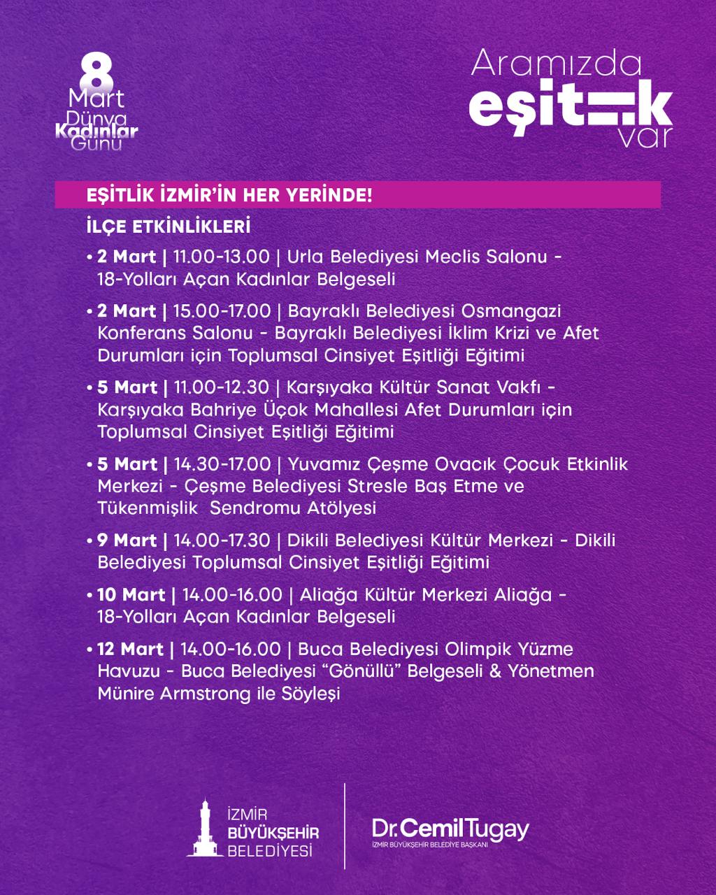 Program yalnızca Kültürpark ile sınırlı kalmıyor. Urla’dan Bayraklı’ya, Karşıyaka’dan Dikili’ye, Aliağa’dan Buca’ya kadar birçok ilçede belgesel gösterimleri, toplumsal cinsiyet eşitliği eğitimleri, iklim krizi ve afetler bağlamında eşitlik atölyeleri, söyleşi ve paneller düzenlenerek 8 Mart’ın mesajı kent geneline taşınıyor. Ayrıca İzmir Kent Konseyi, Ahmed Adnan Saygun Sanat Merkezi ve Tarihi Havagazı Fabrikası gibi önemli mekânlarda gerçekleştirilecek panel ve zirvelerle eşitlik mücadelesi düşünsel zeminde de ele alınıyor.