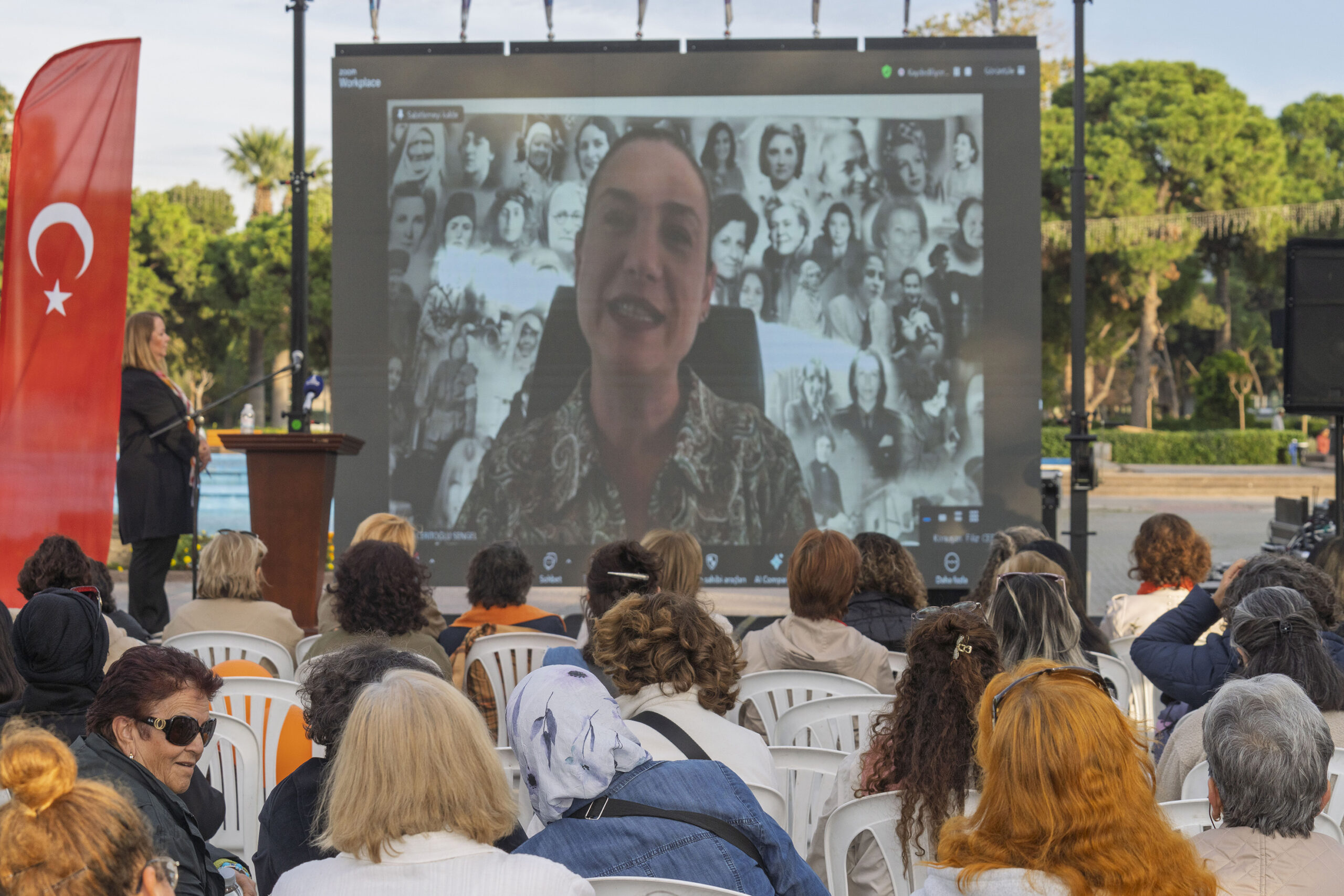 Etkinlikte konuşan İzmir Büyükşehir Belediyesi Genel Sekreter Yardımcısı Prof. Dr. Pınar Okyay, “50’den fazla ülkede yaşayan kadınların yarısı, bedenleri hakkında haklarını kullanamıyor. Ne zaman evleneceklerine, kaç çocuk doğuracaklarına erkekler karar veriyor. Bu erkekler önce babalar ve erkek kardeşleri, büyüdüklerinde de eşleri ya da partnerleri oluyor. Aslında bu, bir toplumsal cinsiyet eşitsizliği sorunu ve bu sorun aynı zamanda kadınlara yönelik şiddeti de getiriyor. Ülkemizde çok yakın zamanda yayınlanan istatistiklere göre her 10 kadından biri yaşamı boyunca fiziksel şiddete maruz kalmış oluyor. Her üç kadından biri ekonomik şiddet görüyor. Yolumuz zorlu ama çok kazanım elde ettik. Çünkü birlikteydik. Birlikte olmaya devam edeceğiz. Yoldaşlığınız çok önemli. Eşit İzmir ve eşit bir dünya için bu yol, birlikte yürünecek bir yol” dedi.