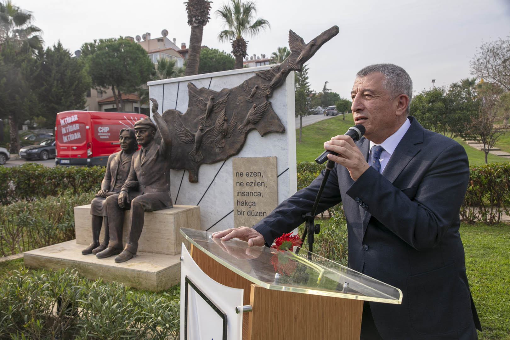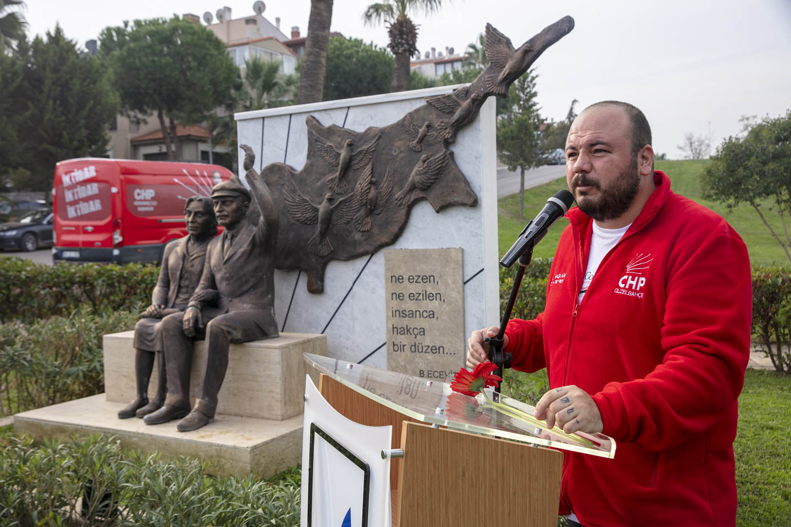 Ecevit’in ne yapmaya çalıştığını olgun yaşa geldiğimizde daha doğru anladığınız liderlerden birisi olduğunu söyleyen CHP Güzelbahçe İlçe Başkanı Devrim Seyrek; “Aslında eksiğimiz de bu koşullara bakmadan, hangi lider olursa olsun onu anlamak yerine ona muhalefet yapmayı doğru buluyoruz. Bu bizim içimizde kronikleşmiş bir durum maalesef. Cumhuriyet Halk Partisi Genel Başkanına, Batı cepheleri komutanına, Milli Şefin karşısına aday olmuş İsmet İnönü‘ye rakip oluyorsunuz. İlk turda salt çoğunluk sağlanamayınca ikinci turda o Milli şef, Atatürk’ün en yakın silah arkadaşı batı cepheleri komutanı sizin lehinize çekiliyor ve Genel Başkan oluyorsunuz. Bu başlı başına konuşulacak bir olay zaten. Ancak Kuzey Kıbrıs Türk Cumhuriyeti’nin temelini atan da bugünkü Kıbrıs Türklerinin de bağımsızlığını hatta Güney Kıbrıs’taki Rumların sorununu da çözen bağımsızlığının önderi olmuş adam olarak karşınıza çıkıyor. Sonra gündüzleri, geceleri bütün köylerde kahvelerde miting yaparak karşımıza çıkıyor. Bütün bunlar gibi kendi siyaseti açısından bizim ona anlayacağımız tarafından anlaşılabilir durum ama ben başka bir şeye dikkat çekmek istiyorum. Bülent Ecevit birincisi şairdi bu bugün dinlediğimiz birçok şarkının da sözlerinin yazarıydı. İkincisi ve önemlisi Bülent Ecevit sadece Rahşan’a değil memleketine, milletine de aşıktı. Bülent Ecevit hem Cumhuriyet’e hem Atatürk’e hem de milletine sevdalıydı şimdi yan yanalar buradaki heykelde olduğu gibi zaten hiç de ayrılmadılar ruhları şad olsun saygı ve sevgiyle anıyoruz” diye konuştu.