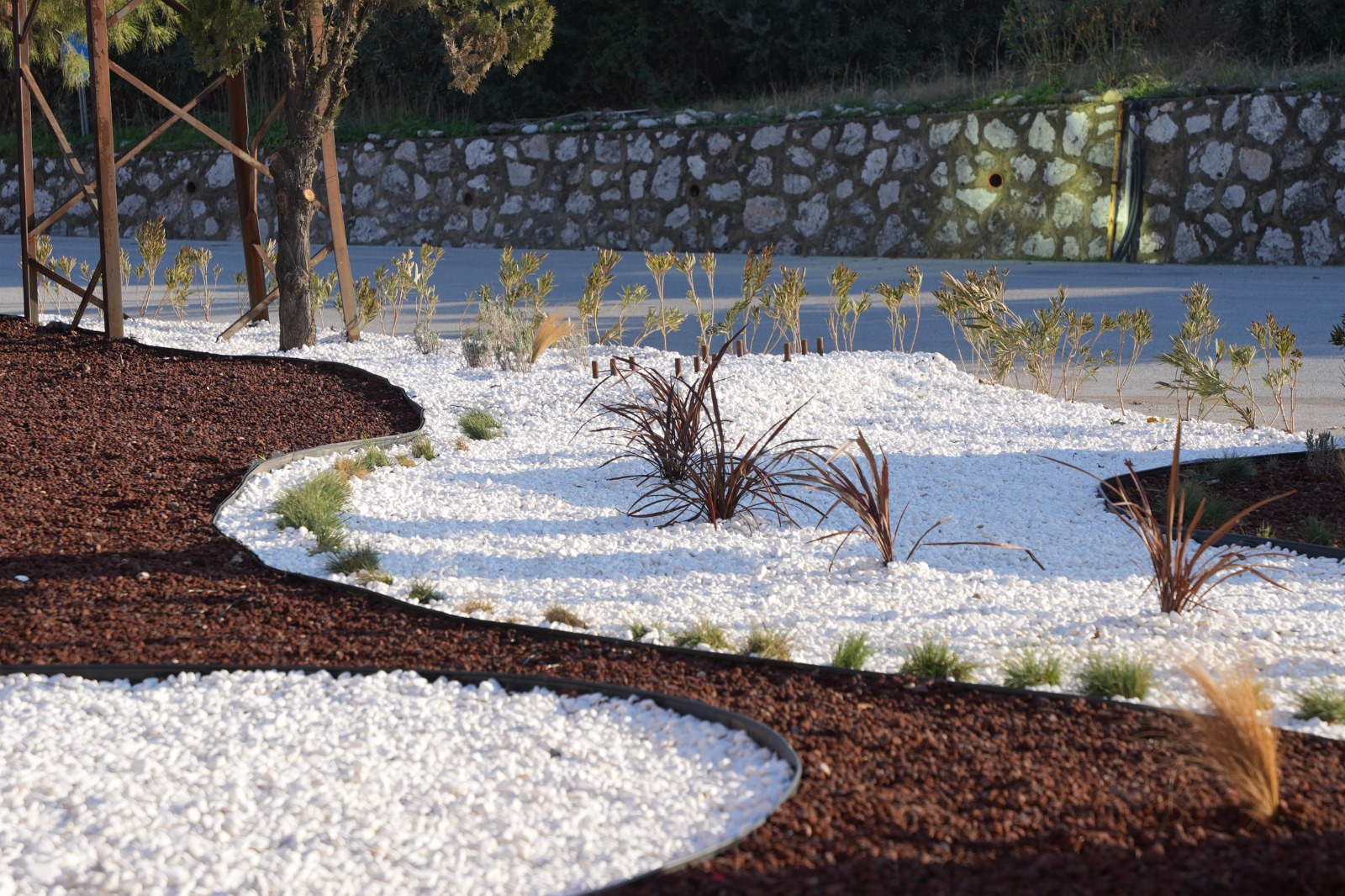 Uygulama kapsamında yüksek su tüketimi gerektiren çim alanlar yerine, kuraklığa dayanıklı bitki türleri tercih edildi. Doğal taş, dekoratif çakıl ve az bakım gerektiren peyzaj unsurlarıyla hem çevre dostu hem de estetik bir görünüm sağlandı. Bu sayede su tüketimi önemli ölçüde azaltılırken, bakım maliyetlerinin de düşürülmesi hedeflendi.