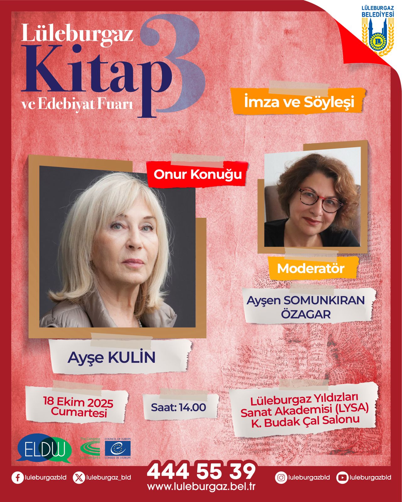 Lüleburgaz 3. Kitap ve Edebiyat Fuarı’nın bu yılki onur konuğu Ayşe Kulin 18 Ekim Cumartesi günü kitapseverlerle bir araya gelecek.