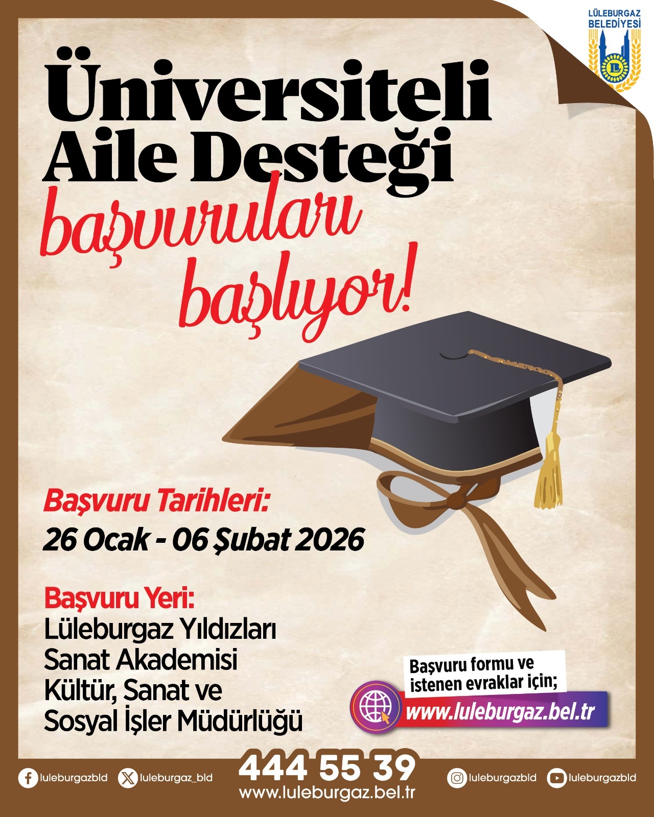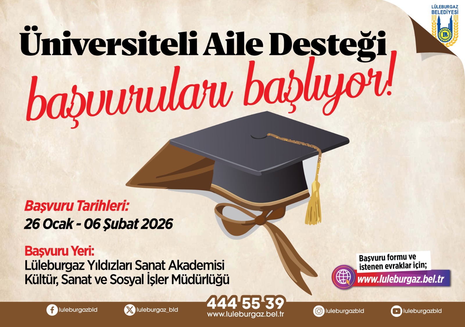 Lüleburgaz Belediyesi’nin Üniversiteli Aile Desteği Programı’nın 2026 yılı Bahar Dönemi başvuruları 26 Ocak tarihinde başlıyor. Destekten faydalanmak isteyip şartları taşıyan kişiler 6 Şubat 2026 tarihine kadar Lüleburgaz Yıldızları Sanat Akademisi’nde (LYSA) bulunan Kültür Sanat ve Sosyal İşler Müdürlüğü’ne müracaat edebilecek.