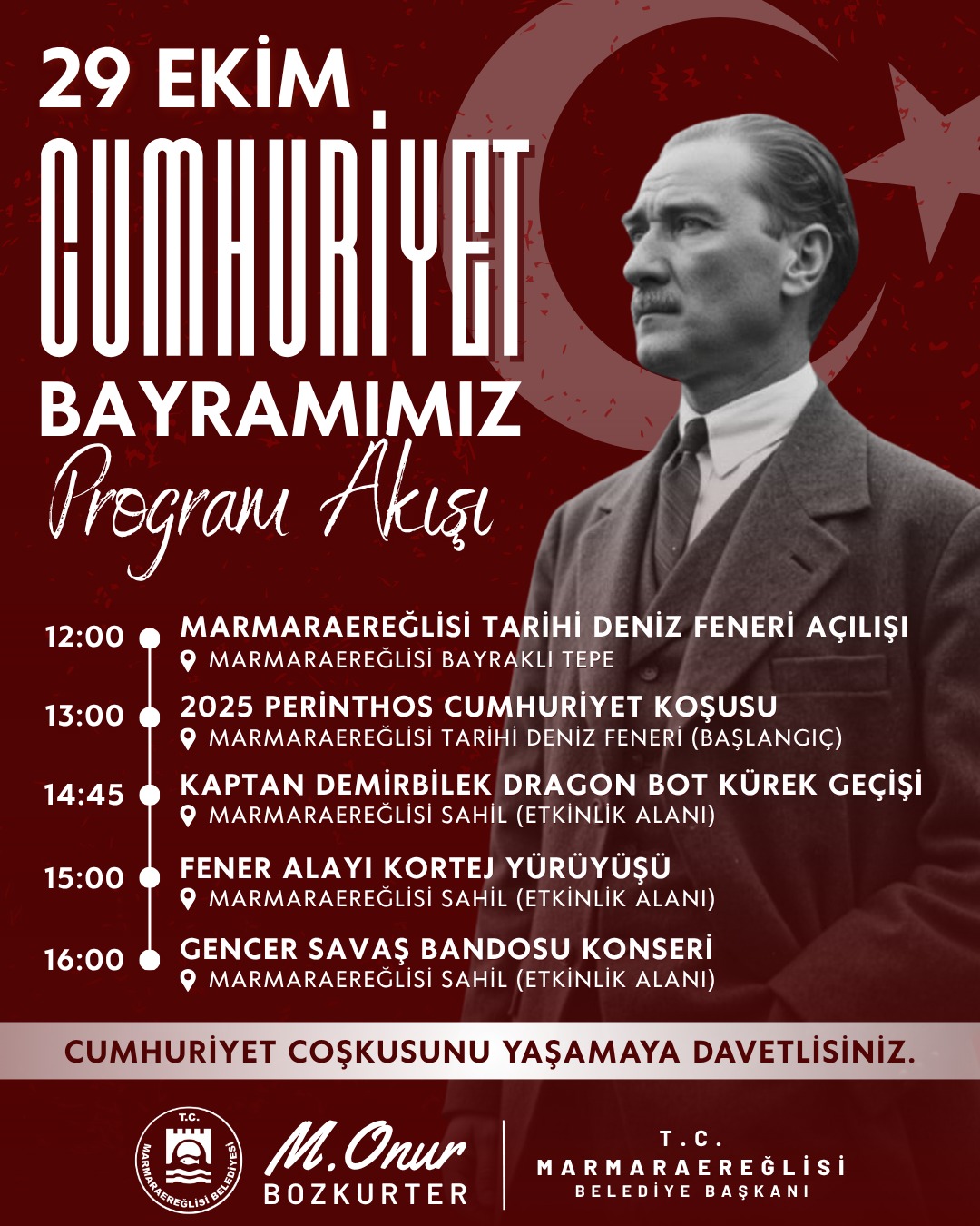 “Cumhuriyetimizin 102. yılını, ilçemizin tarihsel mirasıyla bütünleşmiş büyük bir programla kutluyoruz. Kutlamalarımız tarihi Deniz Feneri’nden başlayacak, ilçemizin her bir noktasına coşku yayılacak. Antik Perinthos sokaklarında ilk kez koşulacak Cumhuriyet Koşusu ve her yıl daha da büyüyen kortej yürüyüşüyle Marmaraereğlisi tarihî bir güne tanıklık edecek. Restorasyonunu tamamladığımız Deniz Fenerimiz, geçmişten geleceğe uzanan ışığımız olacak. Cumhuriyetimizin değerlerini yaşatmaya, Atamızın izinden yürümeye kararlılıkla devam edeceğiz.”