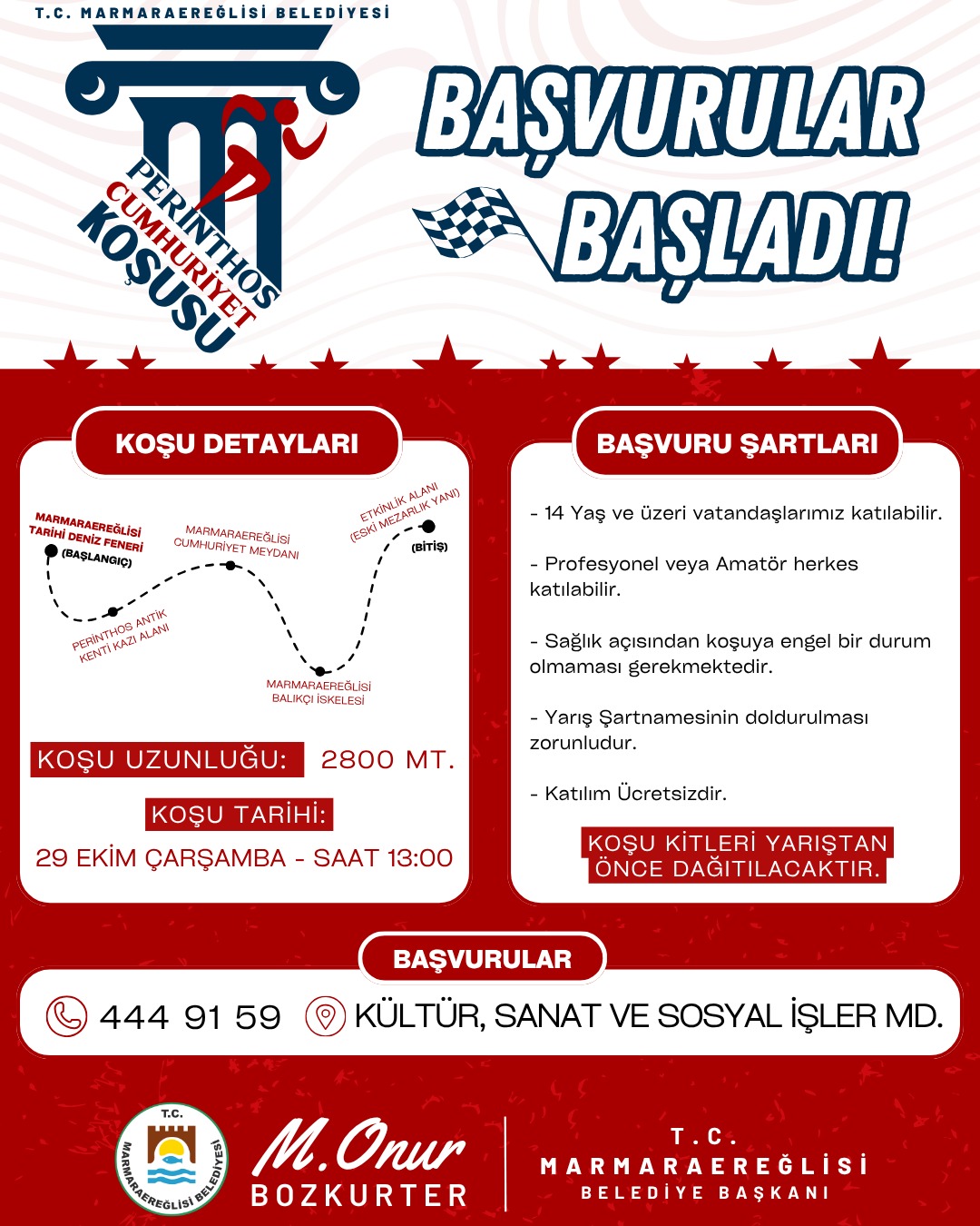 Marmaraereğlisi’nde ilk kez gerçekleştirilecek olan Perinthos Cumhuriyet Koşusu, Atatürk’ün izinde ve Cumhuriyet ruhuyla koşulacak. Start, tarihi Deniz Feneri’nden verilecek. Katılımcılar, antik Perinthos’un sokaklarından geçerek Cumhuriyet Meydanı’nı selamlayacak, ardından Marmaraereğlisi’nin sevilen noktalarından Balıkçılar İskelesi üzerinden etkinlik alanına ulaşacak. “Her adım Cumhuriyete armağan!” sloganıyla düzenlenen koşu, gençten yaşlıya tüm ilçe halkını Cumhuriyetin ışığında bir araya getirecek.
