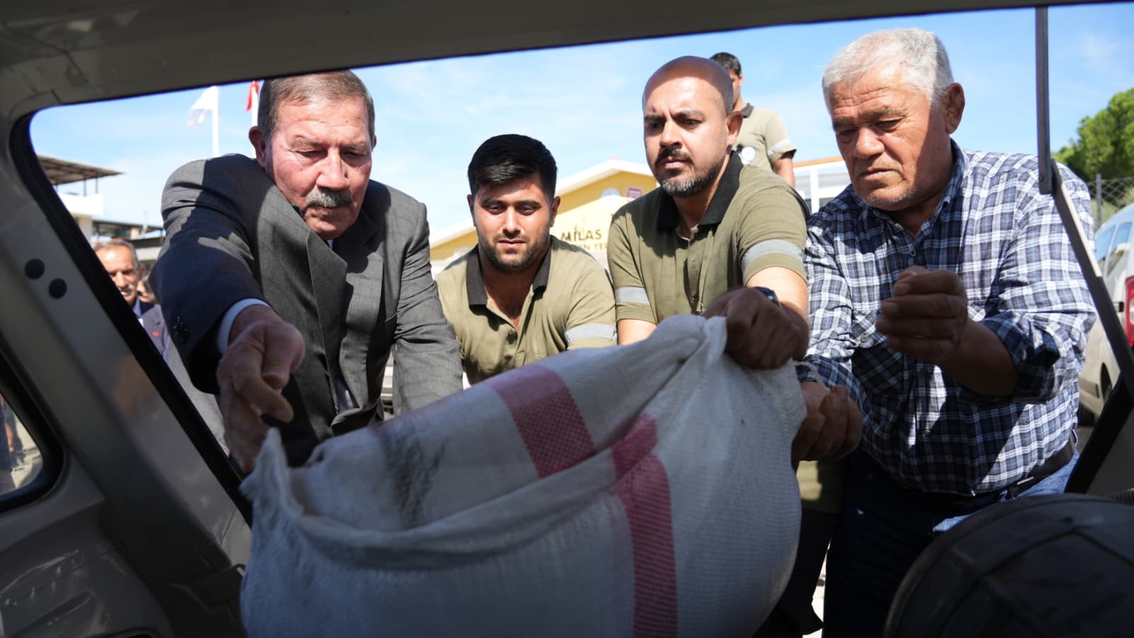 teslim edildi. Üreticilerin buğday çuvallarını araçlarına taşımasına da yardım eden Başkan