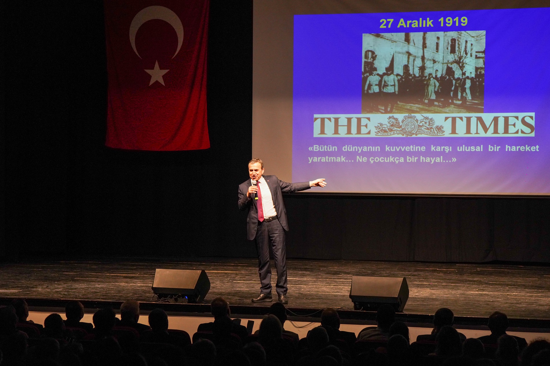 “Tarihin kıskandığı büyük bir lideri, büyük bir insanı, 5 bin yıllık yazılı tarihte eşi görülmemiş bir dahi olan Mustafa Kemal Atatürk’ü anlatmak kolay değil” diyerek konuşmasına başlayan Tarihçi – Yazar Dr. Naim Babüroğlu, “38 yaşında milli mücadeleyi başlattı. İdama mahkûm edildiğinde 39 yaşındaydı. 40 yaşında, 238 yıllık Türk çekilmesini ve toprak kaybını Sakarya Meydan Muharebesi zaferiyle durdurdu. 41 yaşında işgalcilerin hayallerini yerle bir etti ve Nazım’ın dediği gibi Kocatepe’den Afyon ovasına atladı. 42 yaşında Türkiye Cumhuriyeti’ni kurdu ve ilk cumhurbaşkanı seçildi. Ümmeti millet, kulu, değerli birey yaptı” dedi.