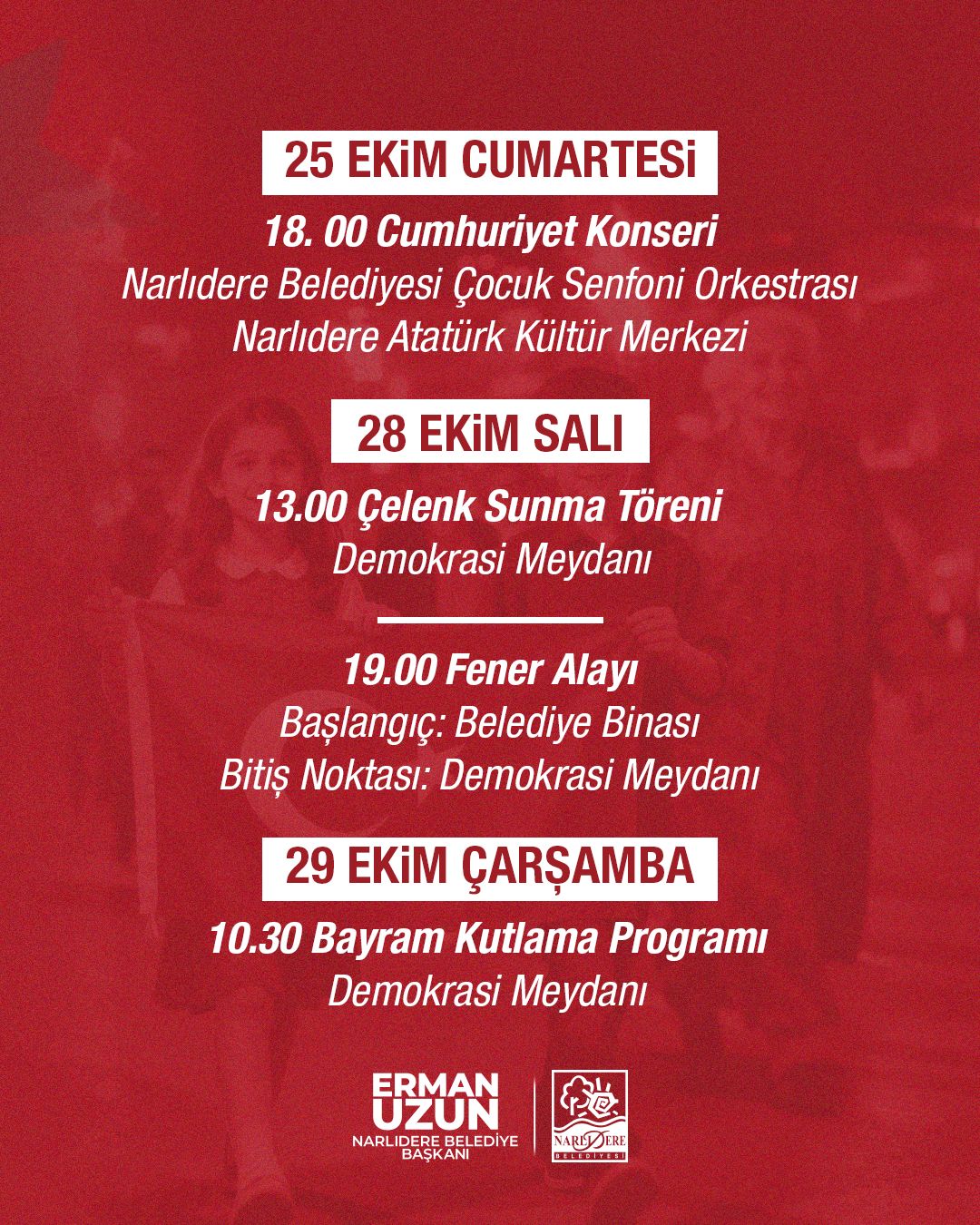 28 Ekim Salı günü saat 13.00’te Demokrasi Meydanı’nda yapılacak resmi çelenk sunum törenin ardından ise saat 19.00’da Narlıdere Cumhuriyet Işığı ile aydınlanacak. Saat 19.00’da Belediye binası önünden başlayacak fener alayı ve kortej yürüyüşü Demokrasi Meydanı’nda son bulacak. Narlıdereliler, fener alayı ile Cumhuriyet’in ışığını bir kez daha gökyüzüne taşıyacak.
