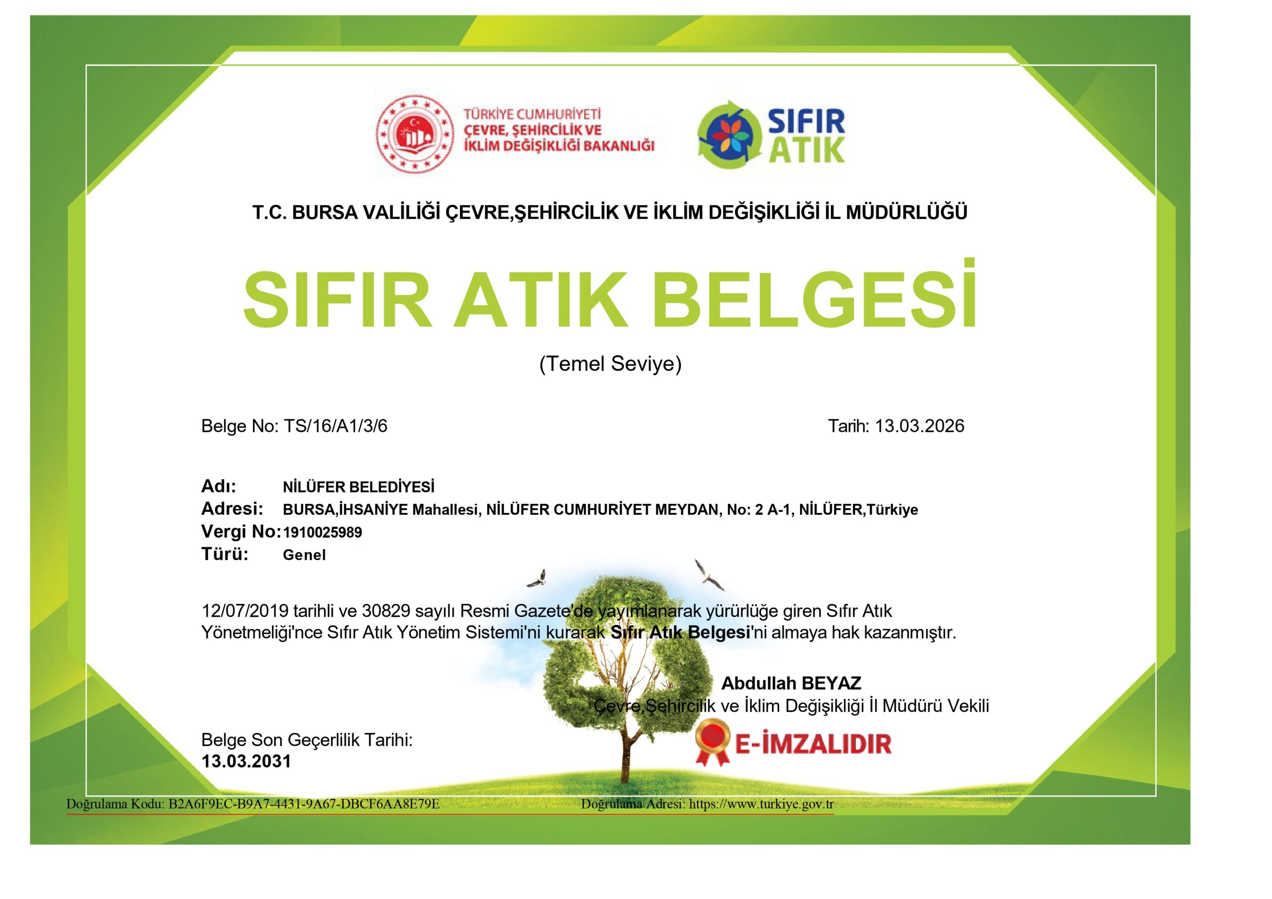 Nilüfer Belediyesi, 12 Temmuz 2019 tarihli Sıfır Atık Yönetmeliği kapsamında kurduğu sistemle Bursa Valiliği Çevre, Şehircilik ve İklim Değişikliği İl Müdürlüğü tarafından verilen Temel Seviye Sıfır Atık Belgesi’ni almaya ve yenilemeye hak kazandı. Söz konusu belge, 13 Mart 2031 tarihine kadar geçerliliğini koruyacak.