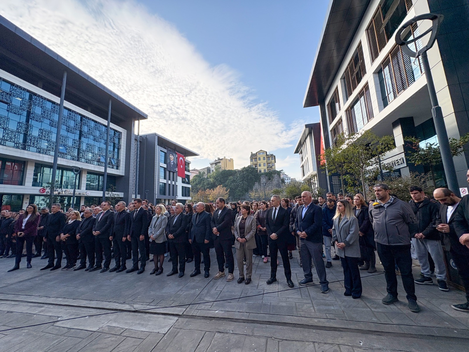 Zorlu’nun konuşmasının ardından Ortahisar Belediyesi önüne asılan dev Atatürk portresinin önünde saat 09.05’te çalan siren ile saygı duruşunda bulunuldu. Saygı duruşunun ardından İstiklal Marşı okundu.