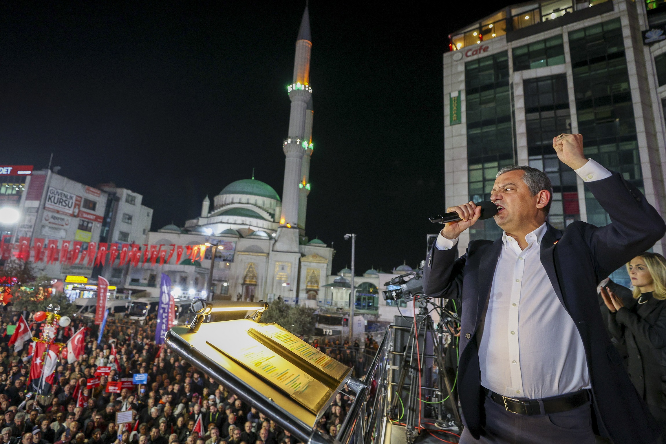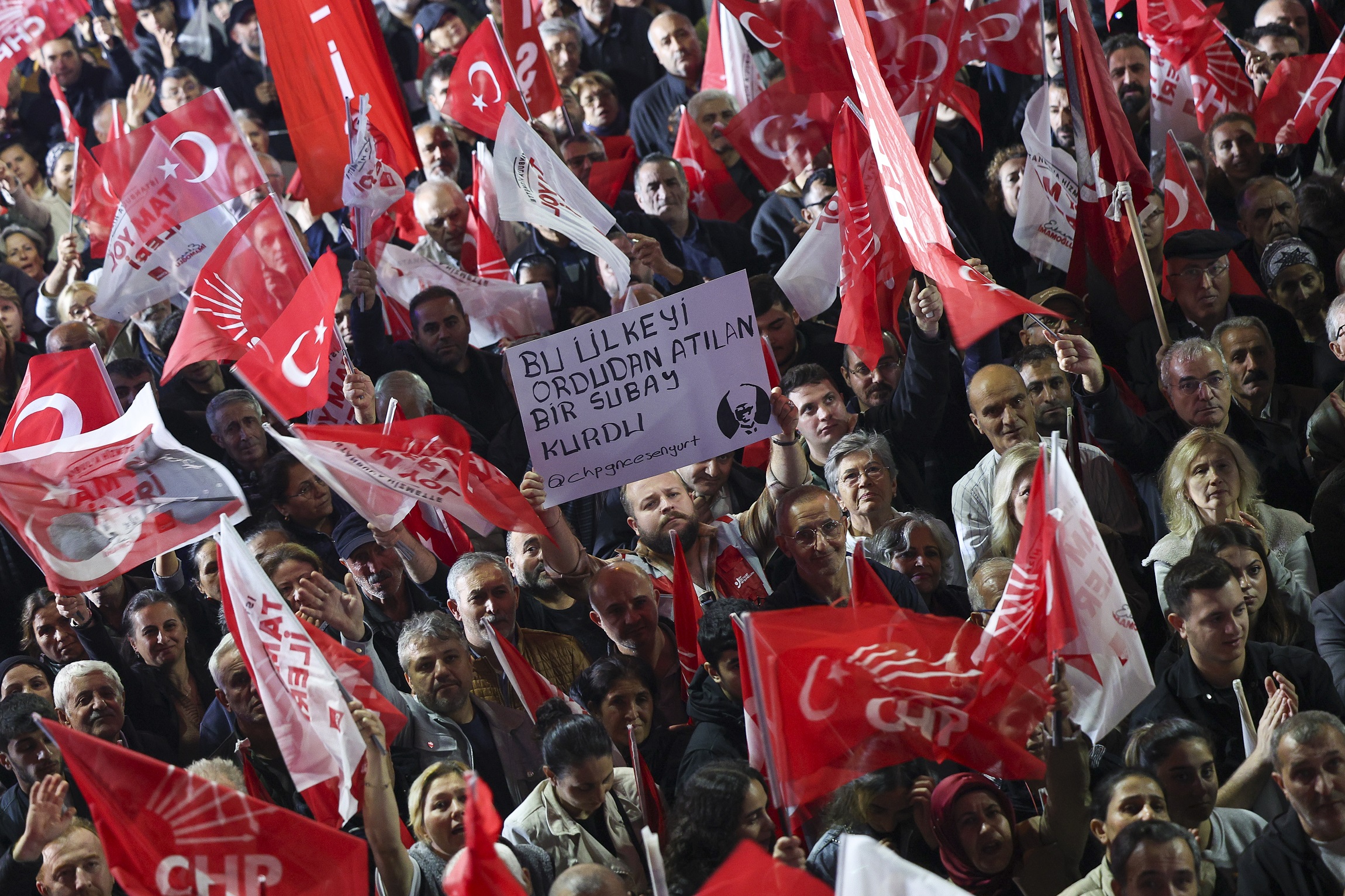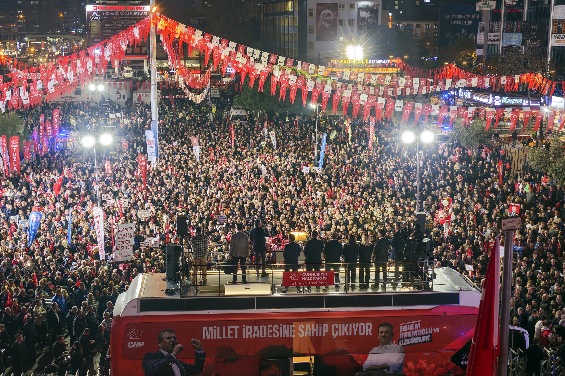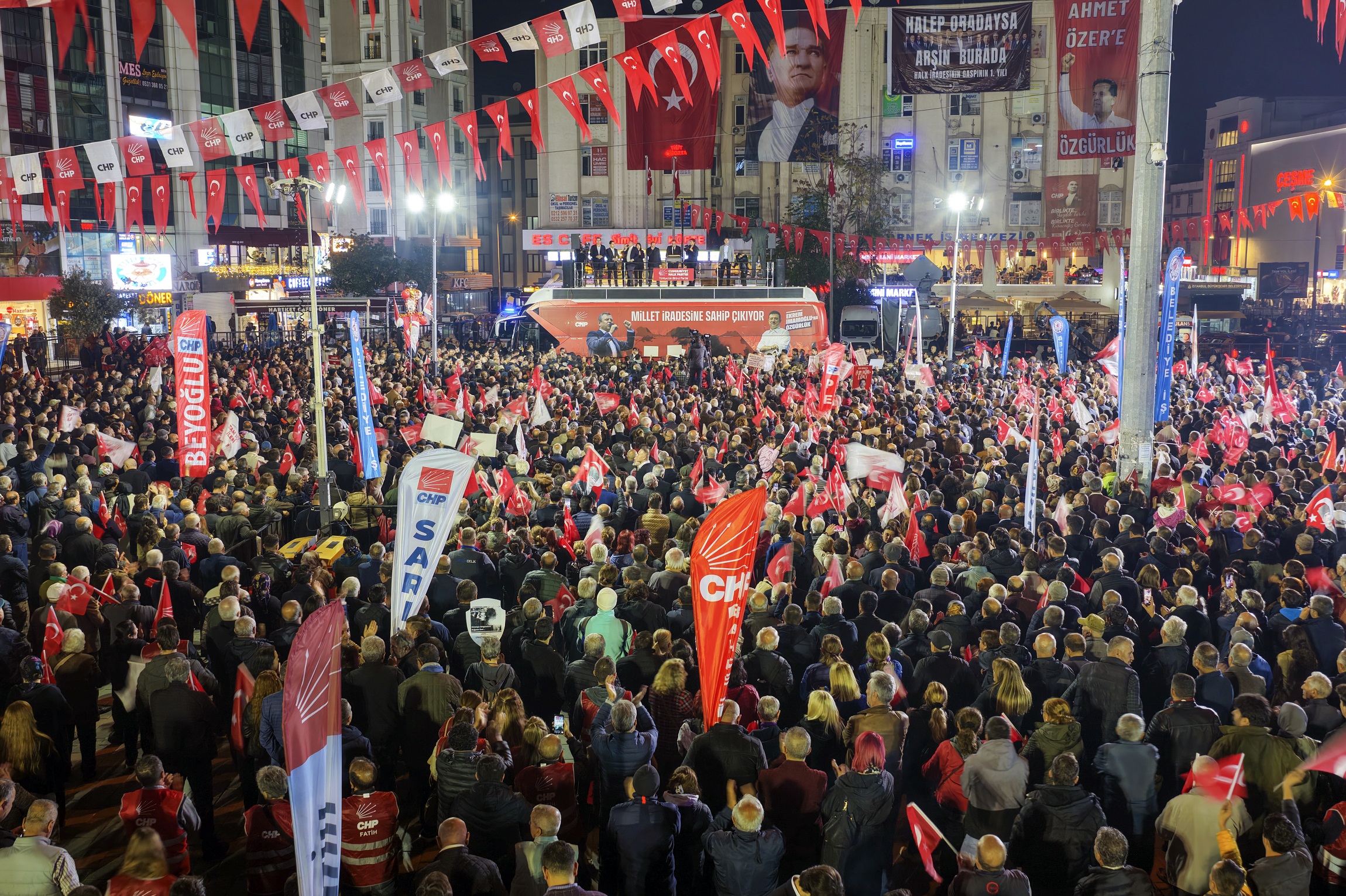 “Size şunu söylüyorum. Biz gençler için yasaksız bir Türkiye, vizesiz bir Avrupa vadediyoruz. Emekliye, asgari ücretliye insanca geçinecekleri maaş vadediyoruz. Tarımla geçinenlere, çiftçilere son Cumhurbaşkanı gibi ‘Al ananı da git’ diyen değil, ilk Cumhurbaşkanı gibi ‘Sen milletin efendisisin’ diyen bir Cumhurbaşkanı vadediyoruz. O Cumhurbaşkanı konusunda bir fikriniz var mı? Bir slogan duyayım. Cumhurbaşkanı İmamoğlu. Çok selam, Ahmet Özer’e çok selam. Bütün belediye başkanlarımıza, yardımcılarına, meclis üyelerimize, bürokratlarımıza yürekten bir dayanışma alkışı. Hem Ahmet Özer’in 3 Kasım duruşmasından beraat bekliyoruz. Hem 3 Kasım’daki, 4 Kasım’daki tensip zaptından bütün arkadaşlarımıza tutuksuz yargılama bekliyoruz. En sonunda da hepimiz eninde sonunda adalet bekliyoruz ve hep beraber Esenyurt‘tan son kez sesimizi yükseltiyoruz. Hak, hukuk, adalet. Bu kötü gidişi durduracağız, irademize de memleketimize de sahip çıkacağız. Dostça, kardeşçe, güzel yarınları birlikte kuracağız. Bu yolu birlikte yürüyecek miyiz? Beraber miyiz? Birlikte yürümeye var mısınız? O zaman yürüyelim arkadaşlar.”