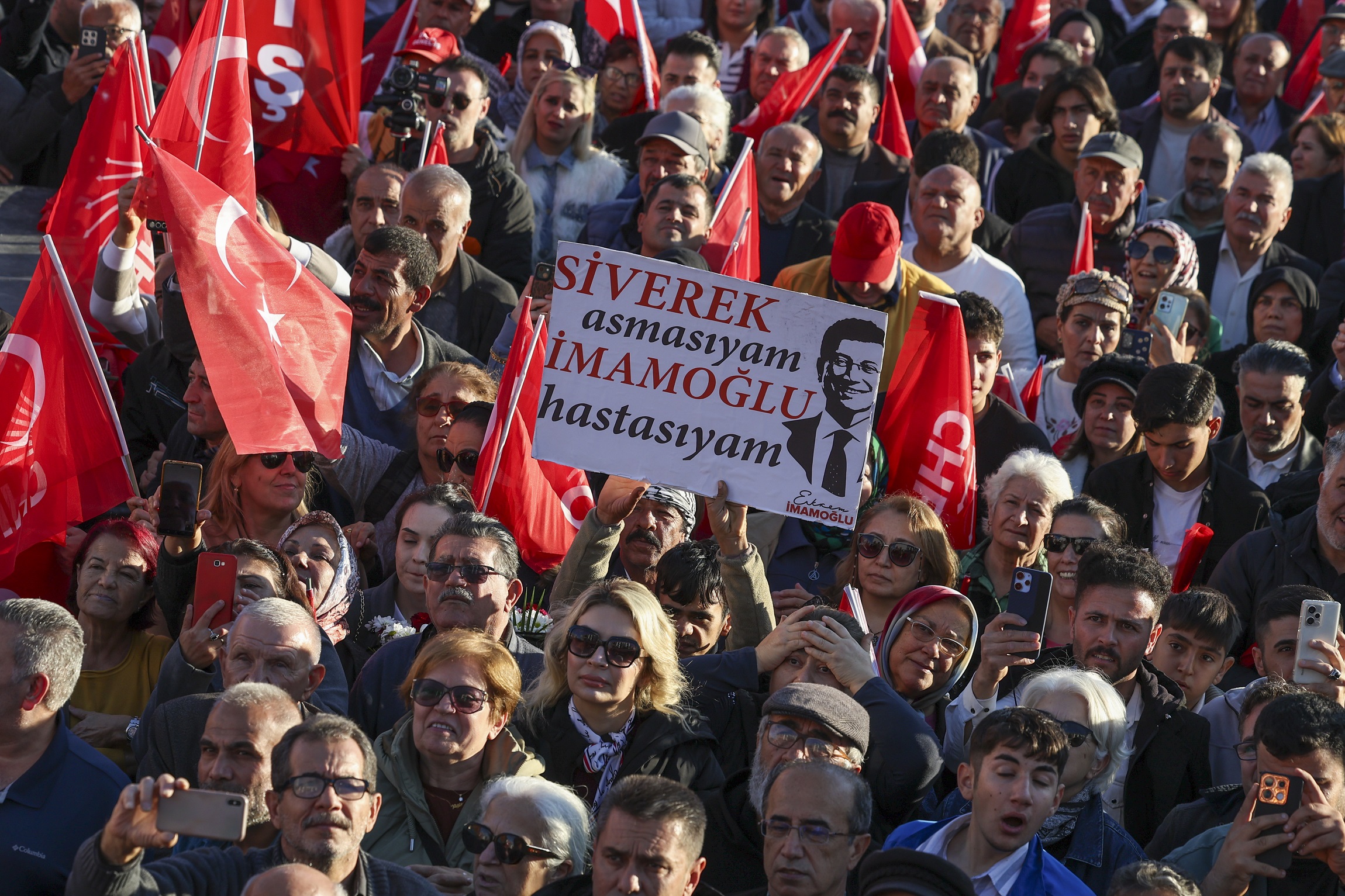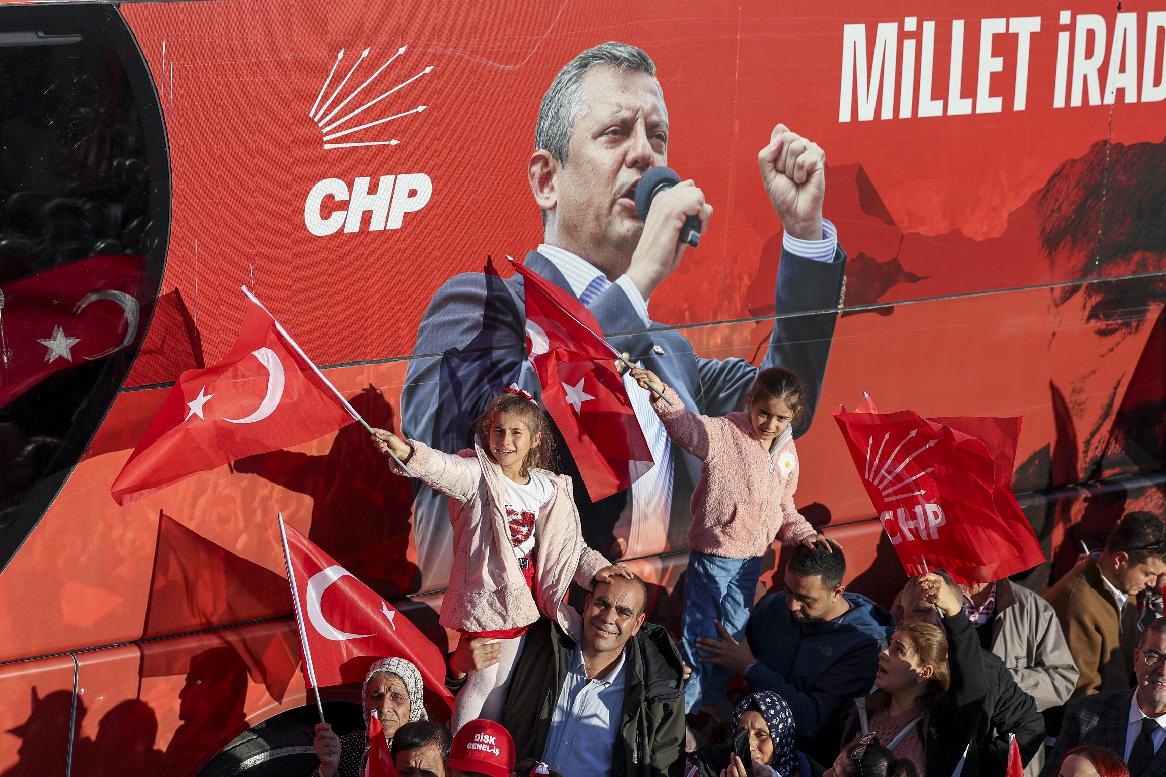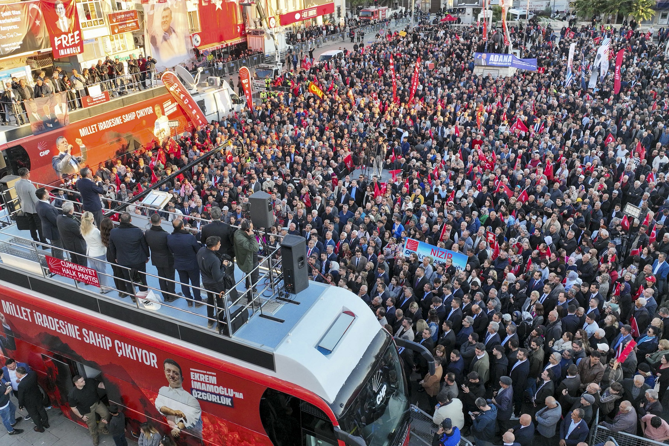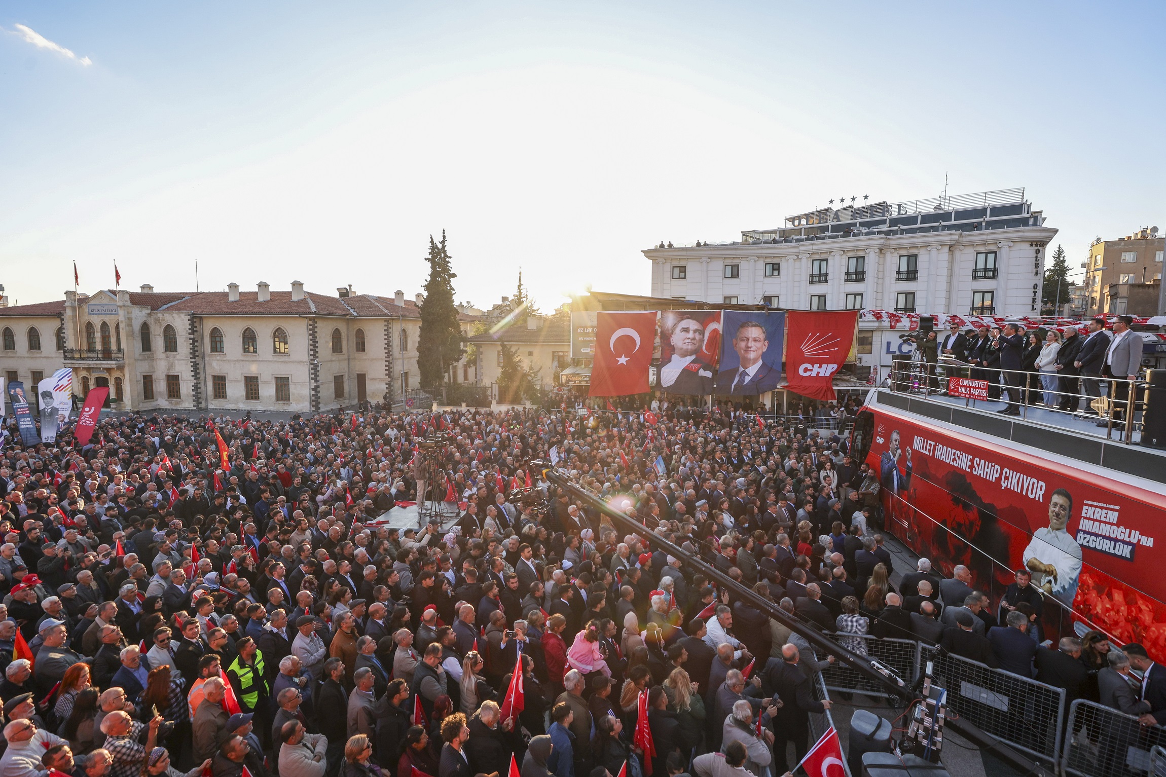 “25 Mart’ta Kilis’te ne dediysek, Türkiye’de bazıları inanmadı o zaman ve ‘Hayal görüyorlar, Kilis de alınır mı?’ dedi. Ama yüzde 42 oyla Hakan kardeşimi göreve getirdiniz. O gün bugün takip ediyorum. Çünkü herhangi bir yerde değiliz. Bize çok önemli destek veren, AK Parti’nin, MHP’nin yıllardır sesini duymadığı Kilis’in sesini duyan, duyuran, onlar için çalışacak olan bir evladınızı arz ettik. Siz de takdir ettiniz, göreve getirdiniz. O gün demiştim ki ‘Seçerseniz bir omzunda Ekrem İmamoğlu’nun eli, bir omzunda Mansur Yavaş’ın eli olacak.’ Seçildiği günden beri her iki başkanımız da Hakan’ı yalnız bırakmadı. Ama 19 Mart’ta Ekrem Başkan’a yapılan operasyonla şimdi o, bu otobüsün üstünde olmak varken 12 metrelik bir hücreden Kilis’i, sizleri izliyor. Sizlere oradan yüreğini açmış, bakıyor. Onu buradan sevgiyle selamlıyoruz. Siz onu 23 Mart günü sandıklara koşarak, 15,5 milyon kişi birlikte aday gösterdiniz. Ama sizin iradenize saygı duymayan birileri diplomasını iptal etmekle başladılar. Dünya kadar haksızlıkla, iftirayla bugünlere geldiler. İşin bu kısmına geleceğim. Ama önce ‘Yanında biziz, arkasında biziz, bir eli omzunda olacak’ dediğimiz, biraz önce de buradan size seslenen Mansur Yavaş Başkanıma Kilis’e sahip çıktığı, Hakan’a abilik, kardeşlik yaptığı için yürekten teşekkür ediyorum.”