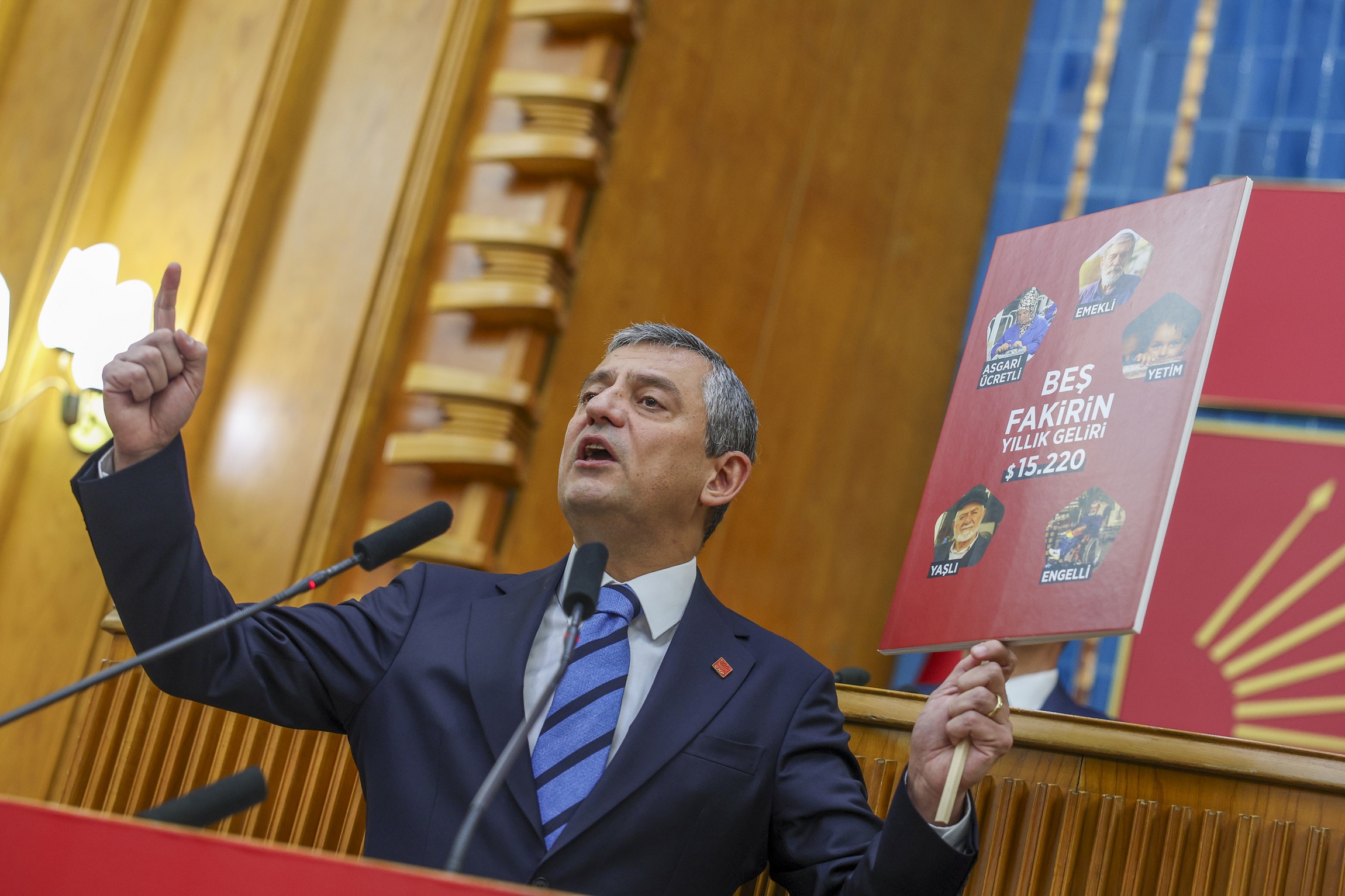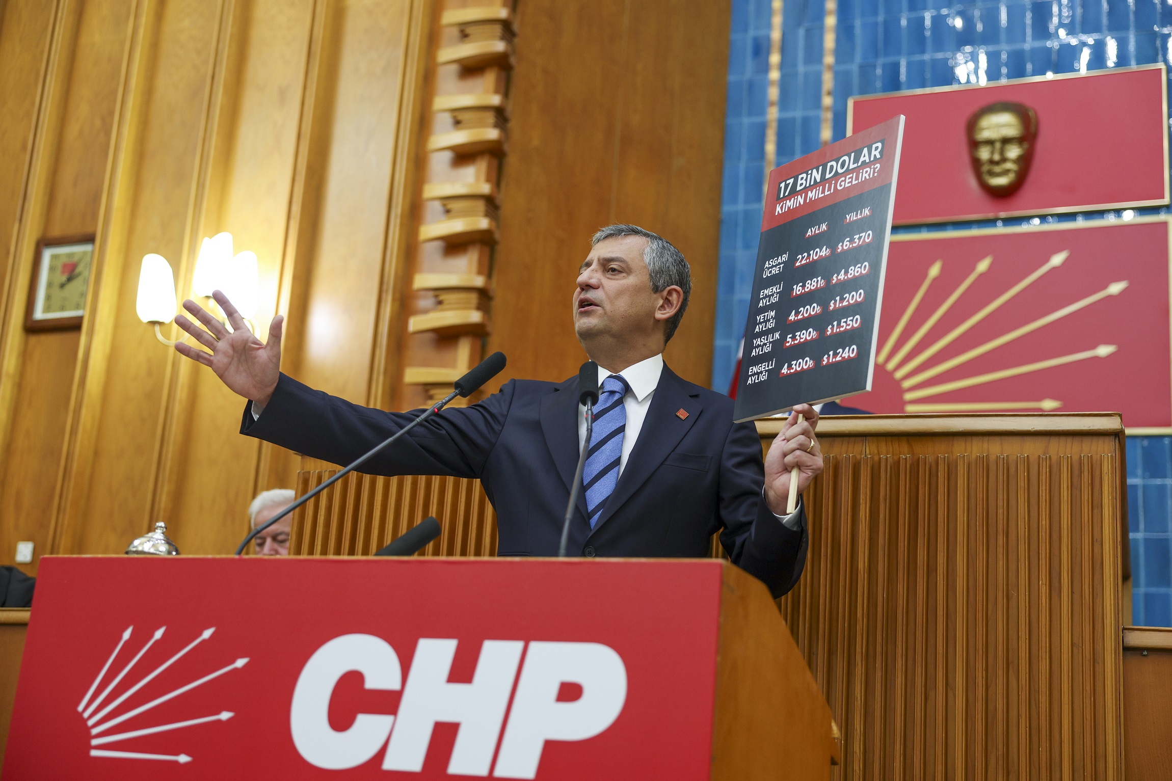 “Siz 17 bin liralık asgari ücreti seçim döneminde, asgari ücret o zamanlar 14 bin liralardayken gerekirse enflasyon tek haneli rakamlara ulaşana kadar ‘Yılda dört kez güncelleyeceğiz’ demiştiniz. Seçimden sonraki yıl asgari ücreti sadece aralık ayında belirlediniz ve bir yıl boyunca bir kuruş zam yapmadınız. 17 bin liralık asgari ücreti geçen sene 22 bin liraya çıkarttınız. Şu anda asgari ücretin 17 bin liradan 22 bin liraya çıktığı güne göre alım gücü 16 bin 500 lira. Dokuz ayda buraya geldi ve üç ay daha eriyecek. Geçen sene yaptığınızın bir benzerini yapmaya, yani gerçek enflasyonu değil; TÜİK enflasyonunu, onu da değil; planladığınız, hedeflenen enflasyonu zam diye vermeye hazırlanıyorsunuz. Asgari ücreti utanmadan, sıkılmadan yüzde 20 arttırmaya niyetleniyorlar. Bu yılın sonunda asgari ücreti 26 bin lira, 26 bin 500 lira yapmaya, bir yıl boyunca da böyle tutmaya niyetleniyorlar. Asgari ücreti yüzde 44 enflasyon varken, geçen sene yüzde 30 artırıp milleti bu hale getirenler, şimdi aynı kötü niyetle adım atmaya niyet ediyorlar. Ve utanmadan, sıkılmadan dün çıktı Erdoğan, diyor ki ‘Kişi başına gelirimiz 17 bin dolara yükseldi. Bunu size müjdeliyorum.’ Erdoğan’ın müjdesine bir de yakından bakalım. Asgari ücret 22 bin lira, bir yıllık asgari ücret 6 bin 370 dolar. Erdoğan diyor ki, ‘Kişi başına 17 bin dolarımız var.’ Emekli aylığı 16 bin 800 lira, yıllık 4 bin 860 dolar. Yetim aylığı yıllık bin 200 dolar, yaşlılık aylığı bin 550 dolar, engelli aylığı yıllık bin 240 dolar. Erdoğan diyor ki ‘17 bin dolar milli gelire ulaştık.’ Bakın 17 bin dolar milli gelir, Erdoğan’ın söylediği. Bir asgari ücretli, bir emekli, bir yetim, bir engelli, bir yaşlı bir araya gelseler 15 bin 220 dolar, beşinin toplamının ortaya koyabildiği toplam geliri. ‘Kişi başına 17 bin dolar’ diyor. Bunların Türkiye’deki toplamı 30 milyon. Bu 30 milyon kişinin beşi bir araya gelse, emeklisi, asgari ücretlisi, dulu, yetimi, yaşlılık maaşı alanı, Erdoğan’ın dediğinden halen daha 2 bin dolar kaybı var bunların. Ve utanmadan sıkılmadan 30 milyon kişinin beşinin birleşerek alabildikleri bir parayı, herkesin aldığını söylüyor. Neden? Hesap belli. Toplam parayı bütün nüfusa bölüyorlar.”