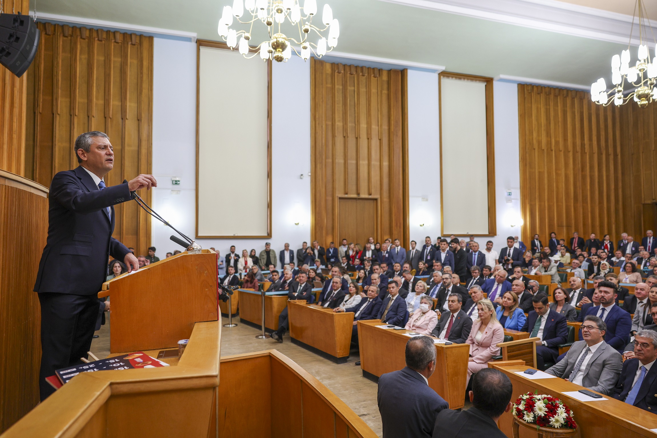 Cumhuriyet Halk Partisi Genel Başkanı Özgür Özel, partisinin TBMM Grup Toplantısında gündem hakkında açıklamalarda bulundu. Cumhuriyet Halk Partisi Lideri Özgür Özel, “Hoş geldiniz, çok teşekkür ediyorum. 28’inci dönem dördüncü yasama yılının ilk grup toplantısındayız. Yeni yasama yılının bu Meclis çatısı altından sorunlarına çözüm bekleyen tüm vatandaşlarımız için hayırlı olmasını diliyorum. Milletvekili arkadaşlarıma, değerli grubumuza, yaz boyunca tatil yerine mücadele eden, 81 ili karış karış gezen, vatandaşın derdini dinleyen, partinin çözümünü söyleyen, partinin kurumsal kimliğine, baba ocağına sahip çıkan, meydan meydan direnen grubumuza ve onları destekleyen tüm üyelerimize, tüm demokratlara yürekten selam olsun. Hepiniz hoş geldiniz, şeref verdiniz” dedi. Özgür Özel, şunları söyledi: