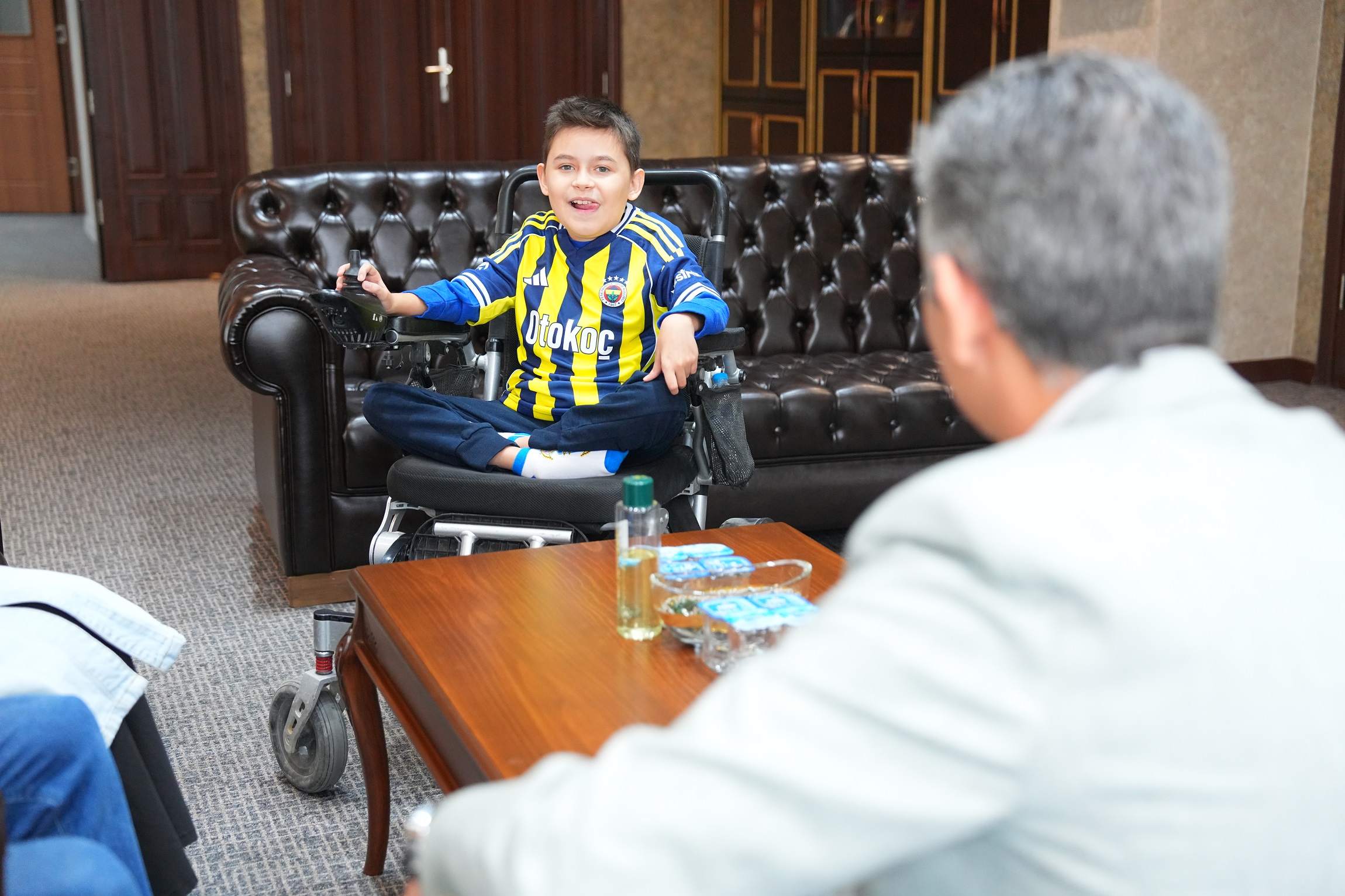 Soma Belediye Başkanı Sercan Okur, DMD (Duchenne Musküler Distrofi) hastalığıyla mücadele eden minik Şenol Berk’i makamında ağırladı. Fenerbahçe taraftarı olan Şenol Berk’e sürpriz yapan Başkan Okur, daha önce söz verdiği gibi sevdiği takımın formasını hediye etti.