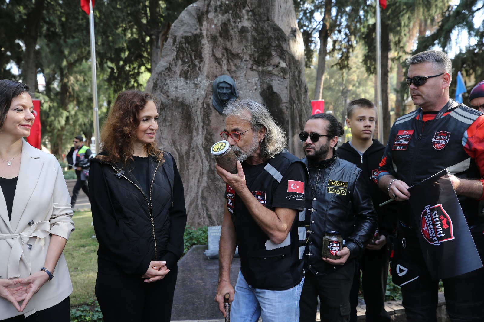 Silivri Motosiklet Grubu Başkanı Özkan Kandemir, “Dağlarında çiçek açtırmaya devam edeceğimiz İzmir’e gelmek bizim için çok önemli bir sürüştü. Zübeyde Annemizin huzurunda olduğumuz için mutluyuz, duygusalız. Belediye Başkanımız Yıldız Ünsal’ın bir Cumhuriyet kadını olarak burada bizimle olması bizi ayrıca duygulandırdı. Baktığınızda bir avuç toprak var ama bu vatanın her bir evladı, o bir avuç toprak için gözünü kırpmadan canını verir. Bu vatana can feda” dedi.