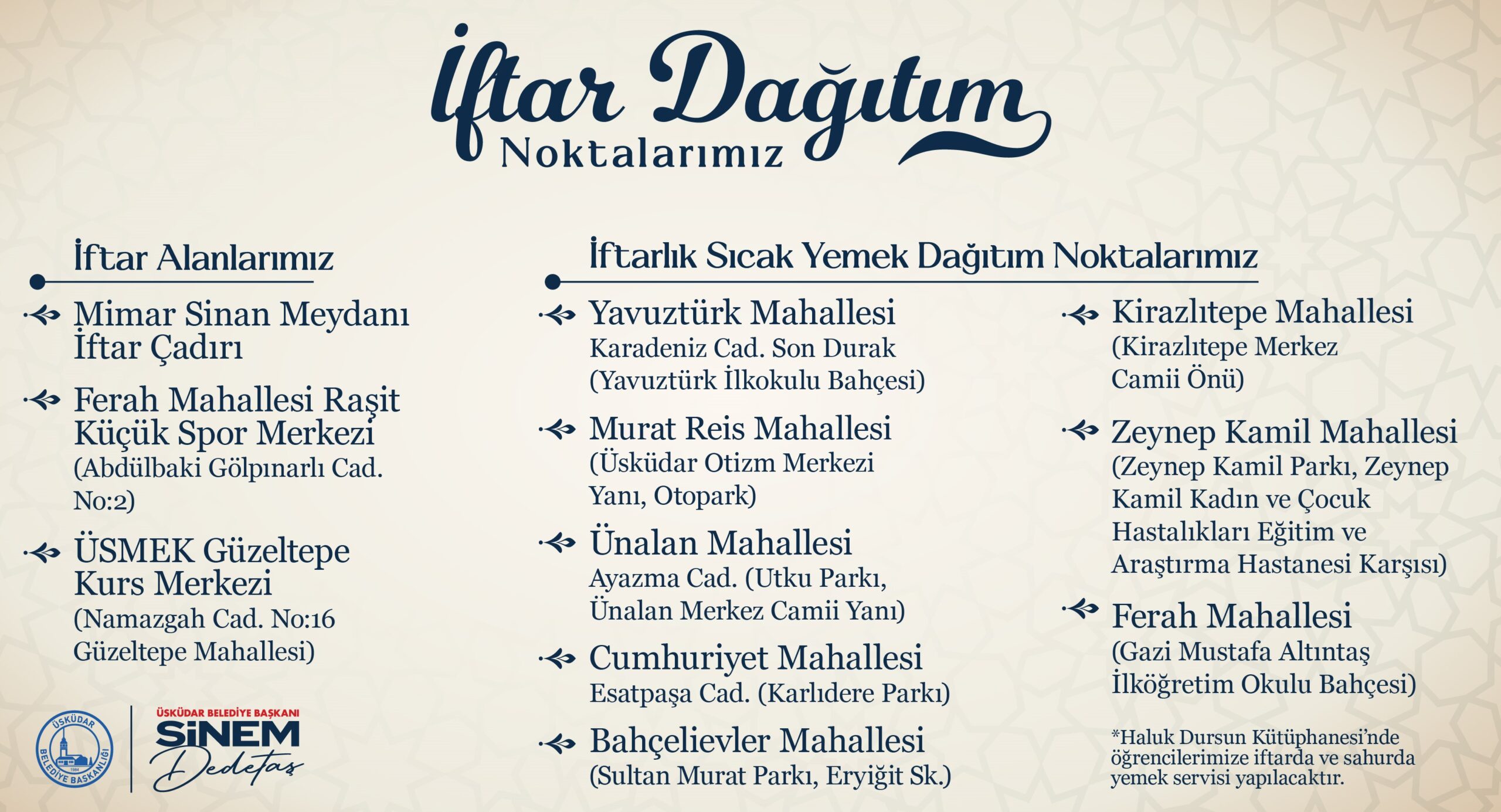 Mimar Sinan Meydanı İftar Çadırı, Ferah Mahallesi Raşit Küçük Spor Merkezi (Abdülbaki Gölpınarlı Caddesi No:2), ÜSMEK Güzeltepe Kurs Merkezi (Namazgâh Caddesi 18/A, Güzeltepe Mahallesi)