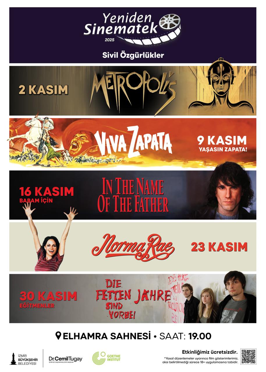İzmirli sinemaseverler, İzmir Büyükşehir Belediyesi Yeniden Sinematek gösterimleriyle kasım ayında da buluşuyor. Elhamra Sahnesi’nde bu ay “Sivil Özgürlükler” seçkisi yer alacak. Seçki, toplumsal yapıdaki aksaklık ve farklılıklar, sınıf mücadelesi ve gücü elinde tutan sisteme karşı azınlığın direnişi gibi konuları içeren filmlerden oluşuyor. Filmler, ücretsiz olarak kasım ayı boyunca her pazar saat 19.00’da gösterilecek. Ayrıntılı bilgi için kultursanat.izmir.bel.tr adresi ziyaret edilebilir.